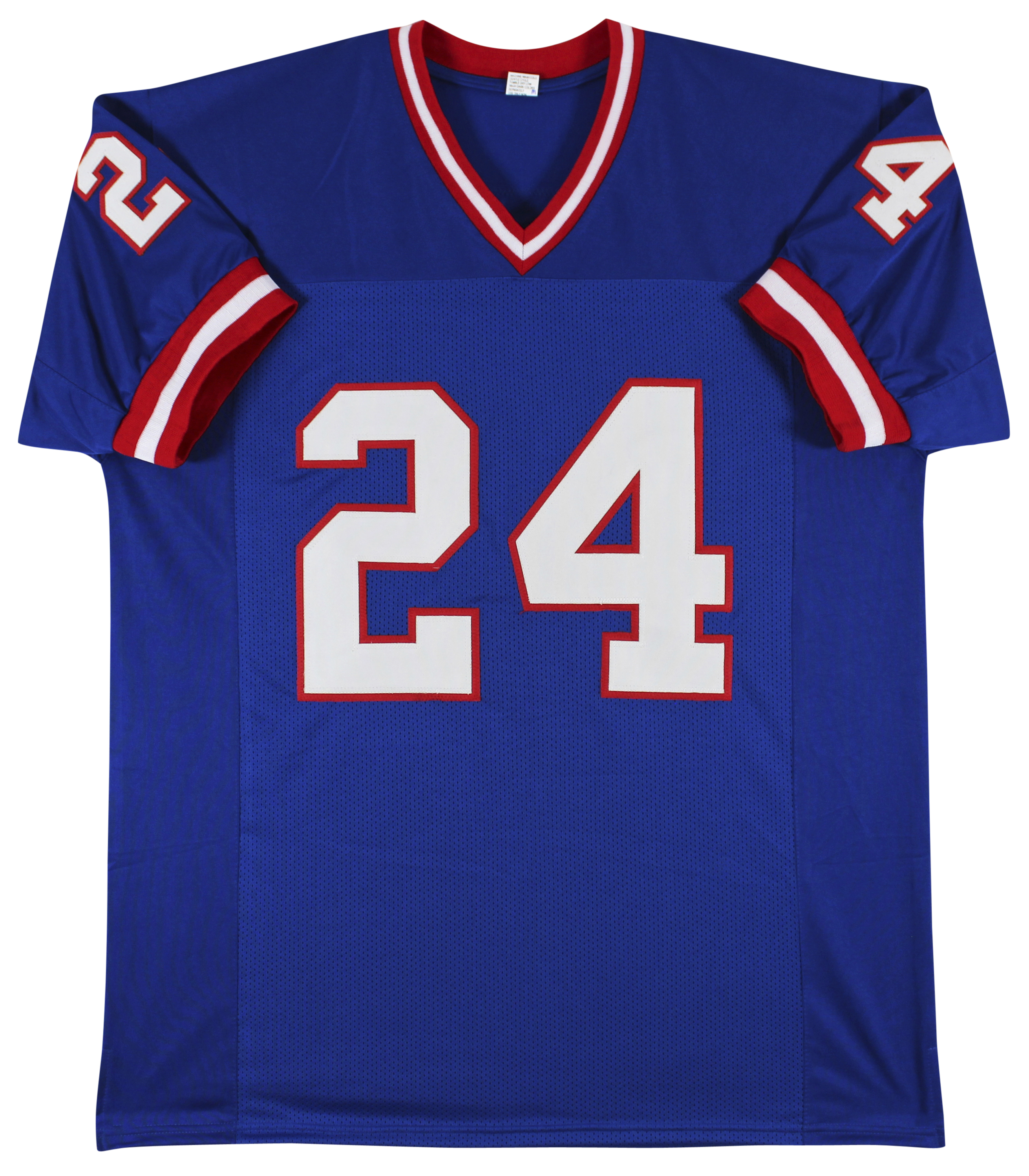 This Autographed Blue Pro Style Jersey with the inscription of "SB XXV MVP" has been Personally Signed by Ottis Anderson of the New York Giants. This item is 100% Authentic to include a hologram by Beckett Authentication Services. This item will come with an affixed Beckett Authentication Services (BAS) authentication sticker, which includes a scannable QR code to verify authenticity. Please note that Beckett no longer provides serial-numbered COA cards, and the attached BAS sticker will serve as the complete authentication for this item. This is a BAS Witnessed Protection Program item which means a Beckett Authentication Service representative was present when this item was being signed. We conducted an autograph signing with Ottis Anderson where multiples of the same item were signed. While the photographs are representative of this item, the size, placement and strength of the signature may vary. Each item is hand signed, therefore, each autograph is unique. This item can be verified through BAS Witnessed. This is a X-Large sized, non-branded, custom-stitched Jersey.
