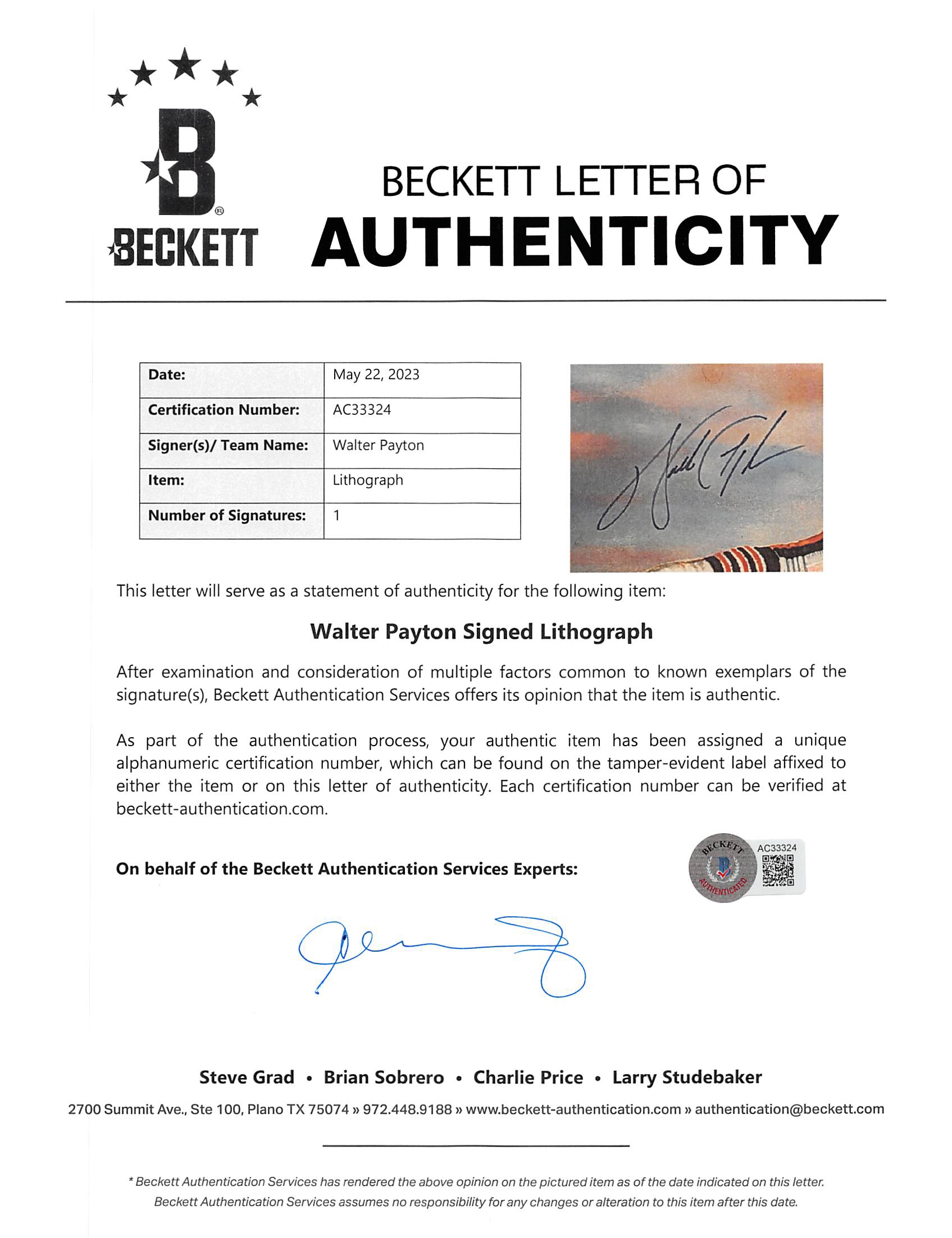 This Autographed Limited Edition #1438/1993 & Framed 20x30 Lithograph has been Personally Signed by Walter Payton of the Chicago Bears. This item is 100% Authentic to include a Certificate of Authenticity (COA) / hologram by Beckett Authentication Services. The authenticity can be verified on Beckett Authentication Services website. This item has been professionally framed to overall dimensions of approximately 30.5 x 39.5 inches. There is some damage to the lithograph, please refer to the closeup photo in the listing.