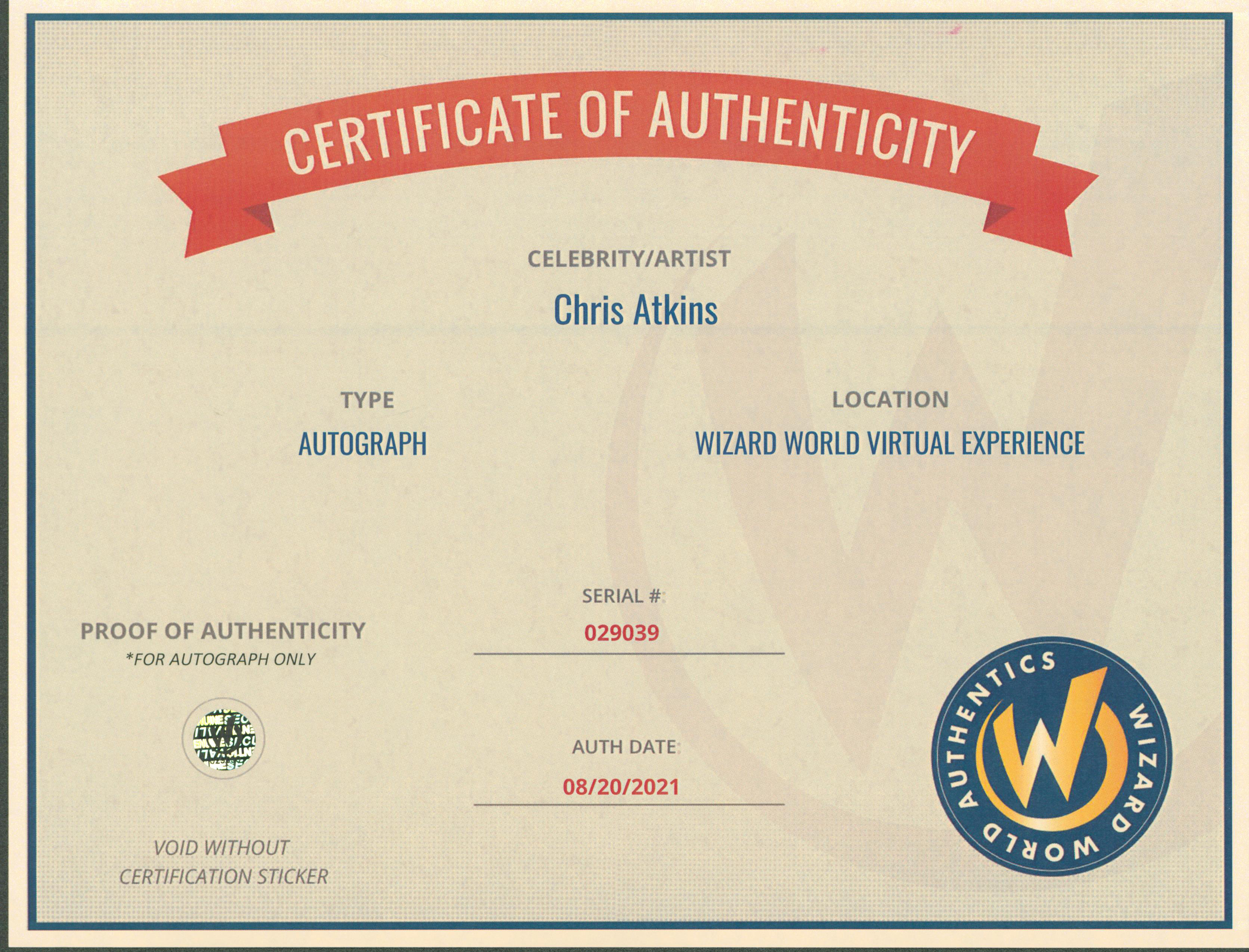 This Autographed 8x10 Photo has been Personally Signed by Chris Atkins of The Blue Lagoon. This item is 100% Authentic to include a Certificate of Authenticity (COA) / hologram by Wizard World Authentics. A Wizard World Authentics representative was present when this item was being signed, the date of the signing is notated on the COA. We have multiples of this same item. While the photographs are representative of this item, the size, placement and strength of the signature may vary. Each item is hand signed, therefore, each autograph is unique.