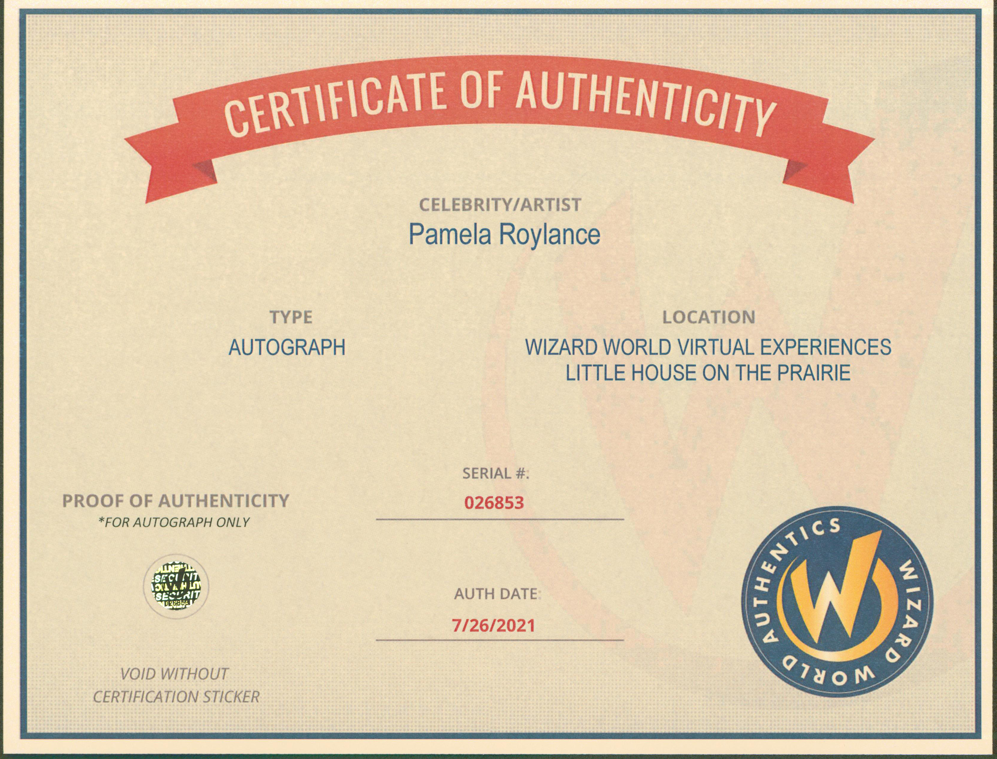 This Autographed 8x10 Photo has been Personally Signed by Pamela Roylance of Little House on the Prairie. This item is 100% Authentic to include a Certificate of Authenticity (COA) / hologram by Wizard World Authentics. A Wizard World Authentics representative was present when this item was being signed, the date of the signing is notated on the COA. We have multiples of this same item. While the photographs are representative of this item, the size, placement and strength of the signature may vary. Each item is hand signed, therefore, each autograph is unique.