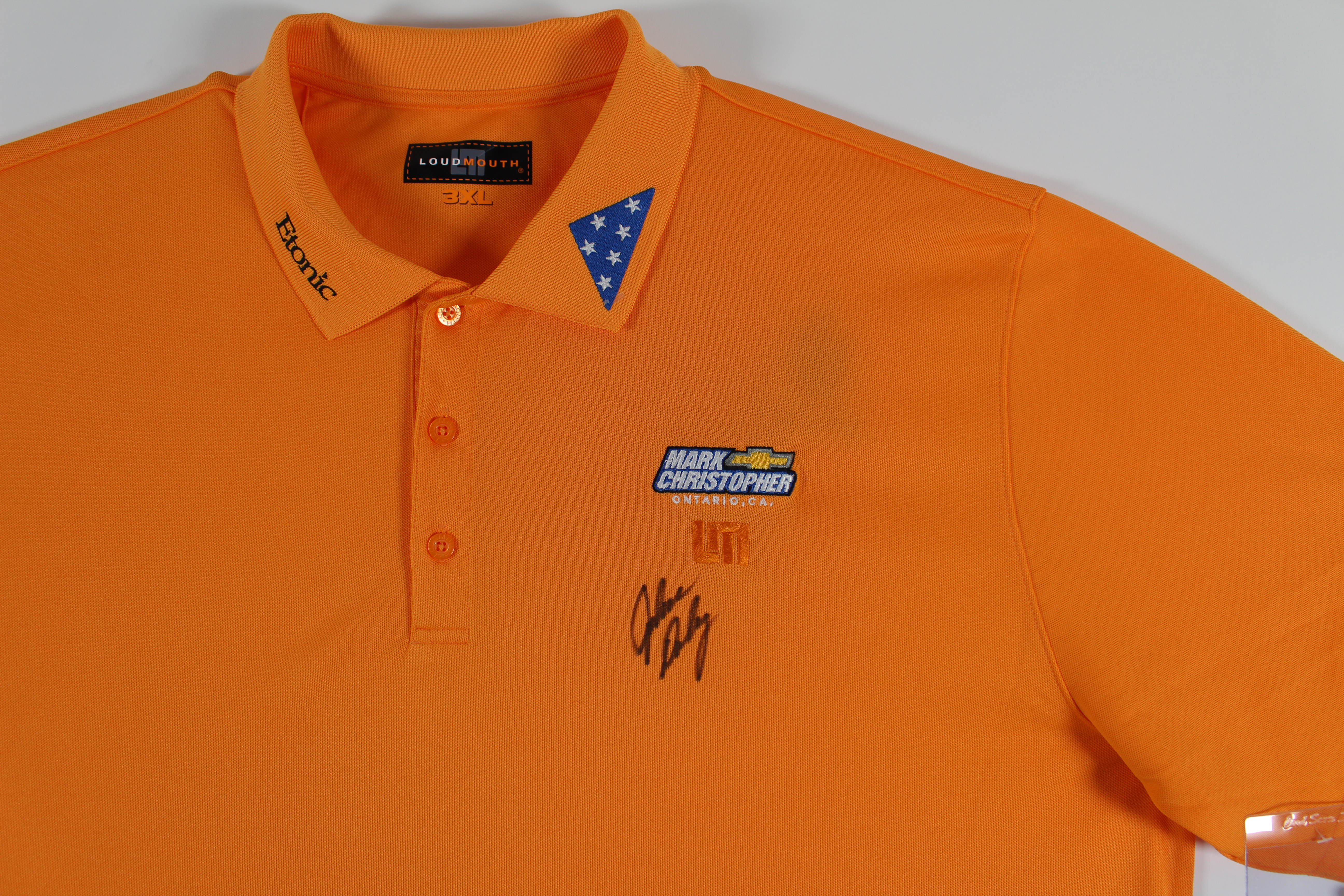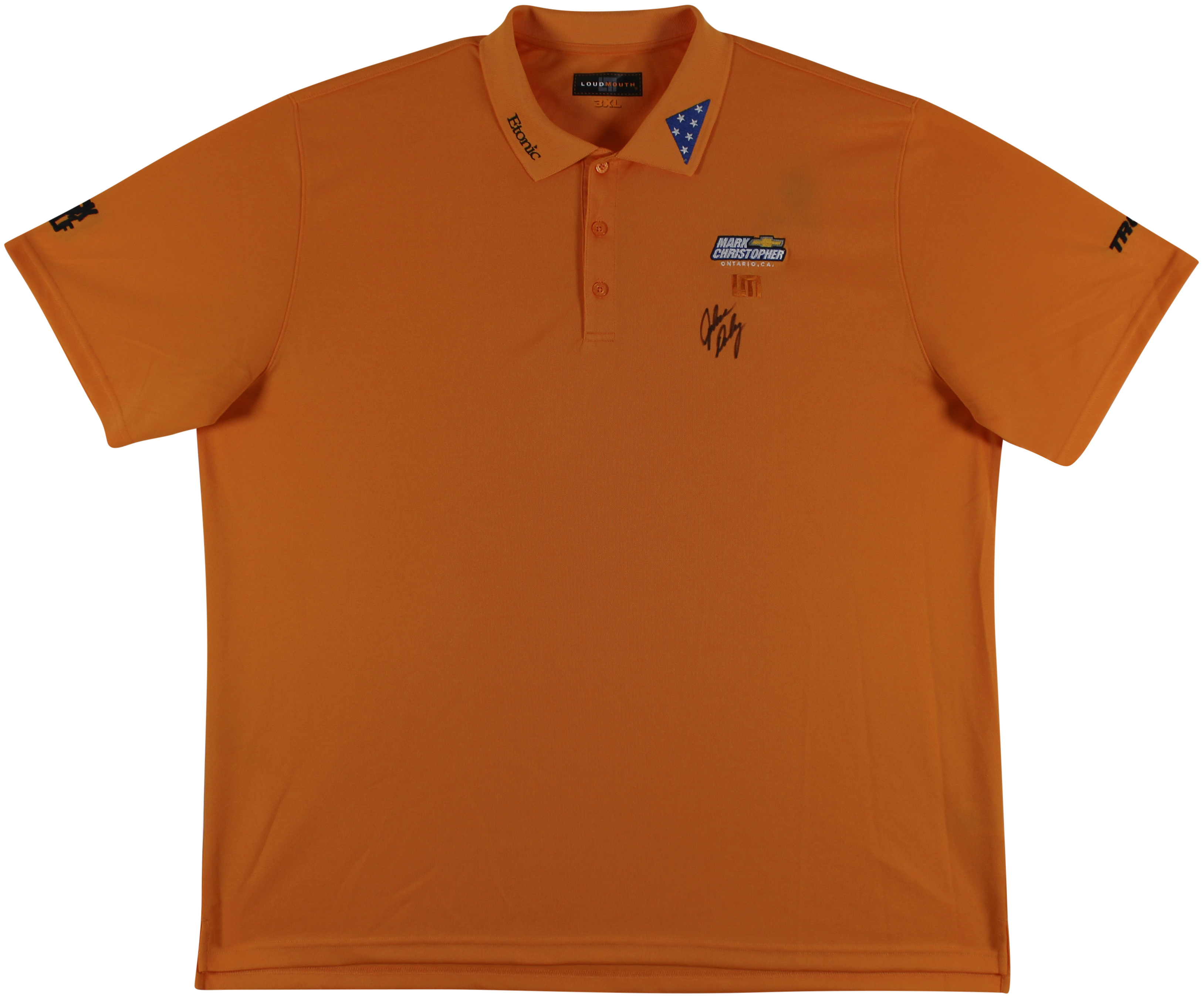 This Autographed Match Worn Orange Folds Of Honor Etonic Mark Christopher Chevy Loudmouth Polo Shirt has been Personally Signed by John Daly. This item is 100% Authentic to include a hologram by Beckett Authentication Services. This item will come with an affixed Beckett Authentication Services (BAS) authentication sticker, which includes a scannable QR code to verify authenticity. Please note that Beckett no longer provides serial-numbered COA cards, and the attached BAS sticker will serve as the complete authentication for this item. The authenticity can be verified on Beckett Authentication Services website. This is a XXX-Large sized Shirt. This match worn Loudmouth Polo shirt has been worn by John Daly, and comes with a letter of Authenticity from John Daly certifying this is match worn & provenance of the item coming from his personal collection.