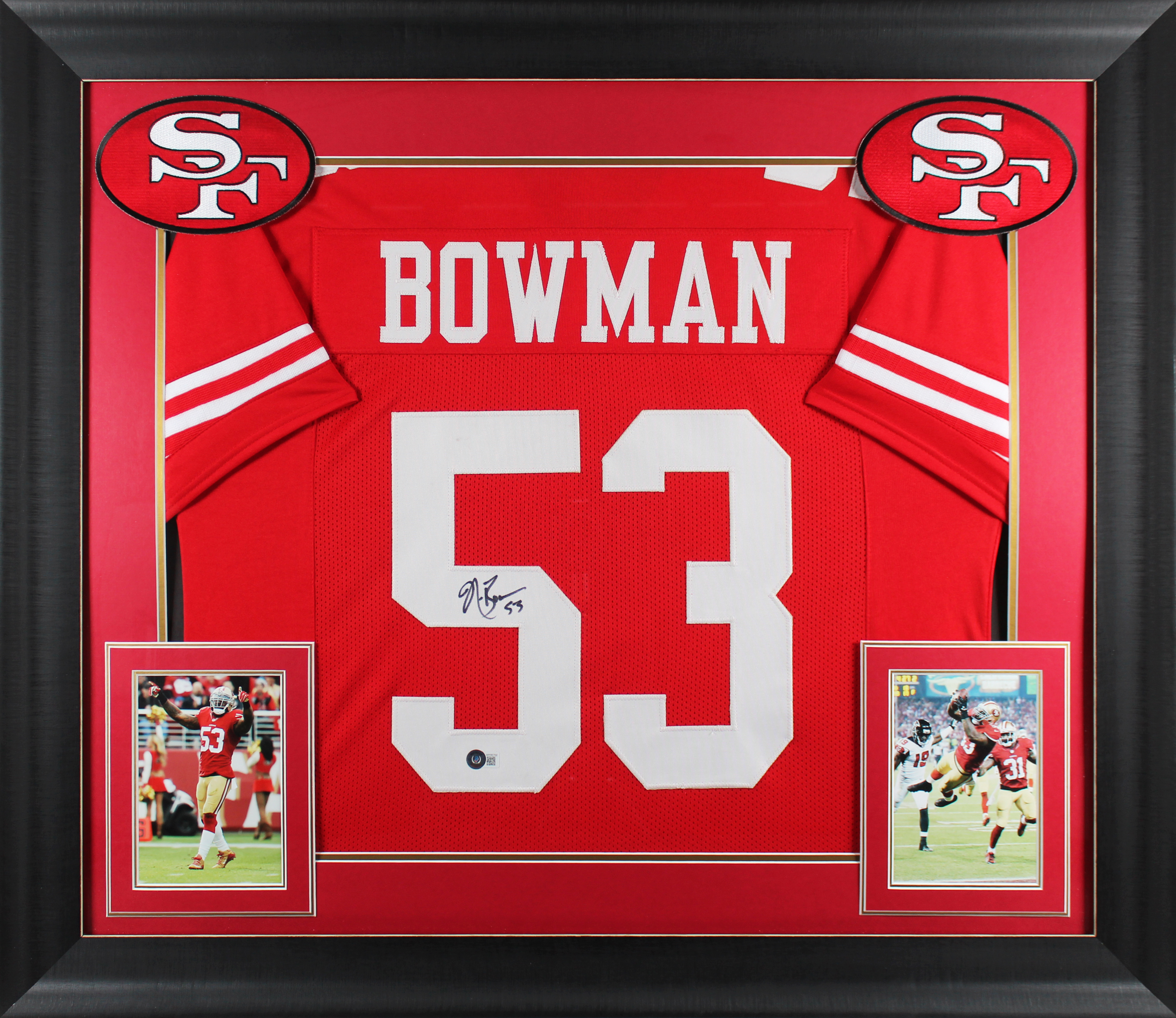 This Autographed Red Pro Style Framed Jersey has been Personally Signed by Navorro Bowman of the San Francisco 49ers. This item is 100% Authentic to include a hologram by Beckett Authentication Services. This item may come with the new Beckett Authentication hologram that has a scannable QR code rather than the traditional COA. If you would like to have a COA, you are welcome to reach out to Beckett for a printed certification once you receive your item. This is a BAS Witnessed Protection Program item which means a Beckett Authentication Service representative was present when this item was being signed. We conducted an autograph signing with Navorro Bowman where multiples of the same item were signed. While the photographs are representative of this item, the size, placement and strength of the signature may vary. Each item is hand signed, therefore, each autograph is unique. This item can be verified through BAS Witnessed. This item has been professionally framed to overall dimensions of approximately 32 x 37 inches. This is a X-Large sized, non-branded, custom-stitched Framed Jersey. This jersey will be framed to order, it will take 3-4 days from purchase date for it to ship.