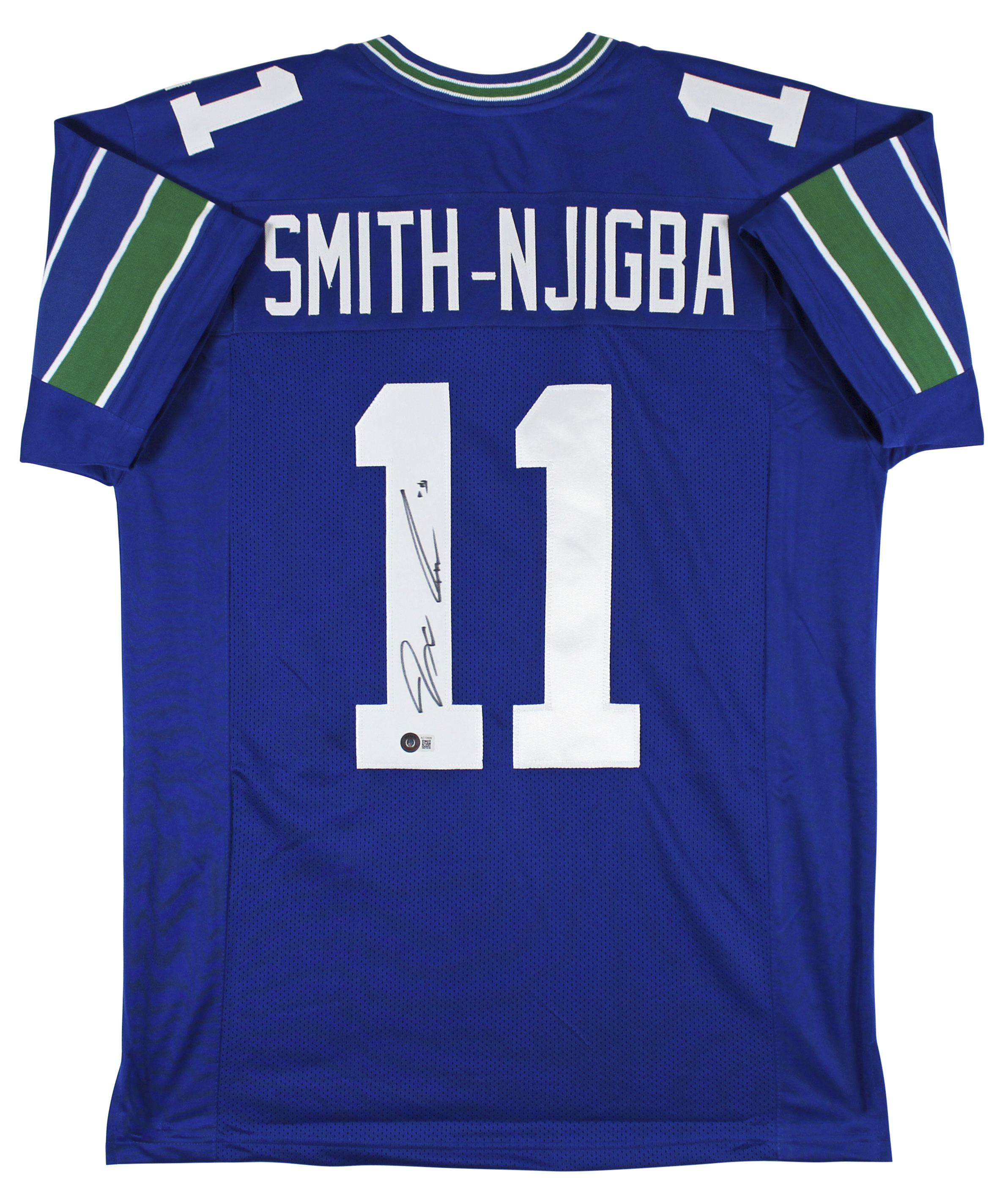 This Autographed Blue Throwback Pro Style Jersey has been Personally Signed by Jaxon Smith-Njigba of the Seattle Seahawks. This item is 100% Authentic to include a hologram by Beckett Authentication Services. This item will come with an affixed Beckett Authentication Services (BAS) authentication sticker, which includes a scannable QR code to verify authenticity. Please note that Beckett no longer provides serial-numbered COA cards, and the attached BAS sticker will serve as the complete authentication for this item. We have multiples of this same item. While the photographs are representative of this item, the size, placement and strength of the signature may vary. Each item is hand signed, therefore, each autograph is unique. This is a X-Large sized, non-branded, custom-stitched Jersey.
