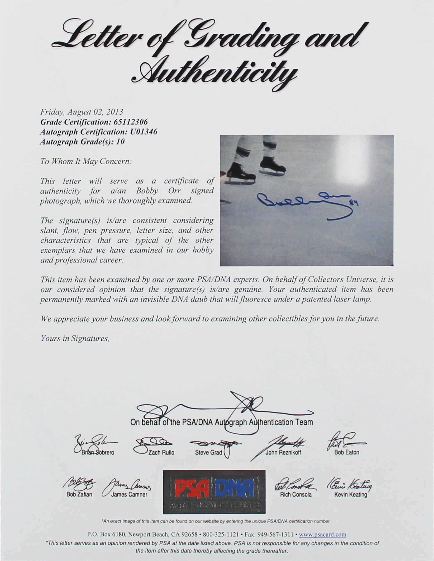 This Autographed Auto Graded Gem Mint 10! 16x20 Photo has been Personally Signed by Bobby Orr of the Boston Bruins. This item is 100% Authentic and comes with a PSA/DNA Certification Card and a matching numbered Hologram.The authenticity can be verified on Professional Sports Authenticator website. ..