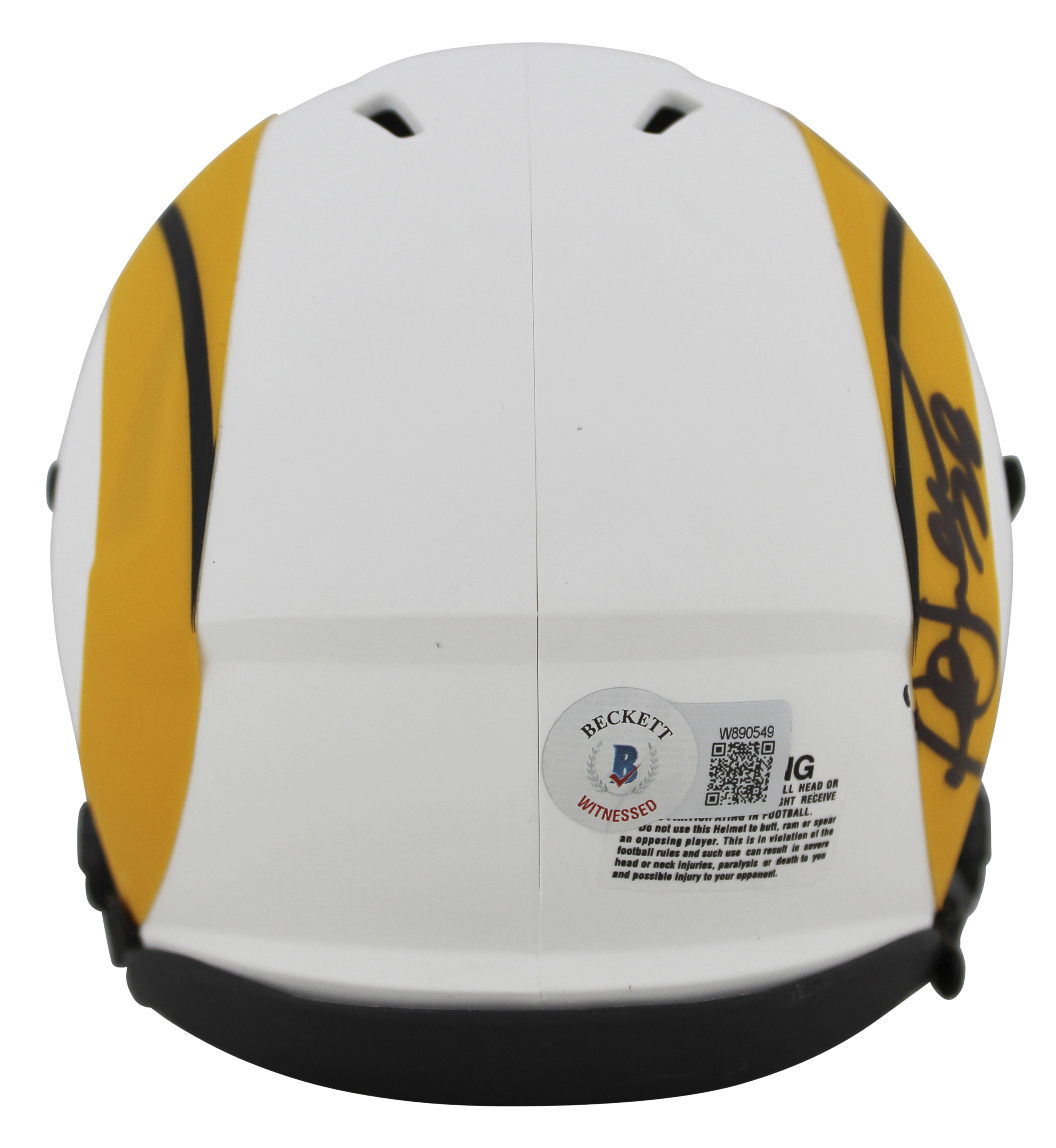 This Autographed Alternate Lunar Speed Mini Helmet with the inscription of "HOF 99 (Dickerson)" has been Personally Signed by Eric Dickerson & Marshall Faulk of the Los Angeles Rams. This item is 100% Authentic to include a hologram by Beckett Authentication Services. This item will come with an affixed Beckett Authentication Services (BAS) authentication sticker, which includes a scannable QR code to verify authenticity. Please note that Beckett no longer provides serial-numbered COA cards, and the attached BAS sticker will serve as the complete authentication for this item. This is a BAS Witnessed Protection Program item which means a Beckett Authentication Service representative was present when this item was being signed. We conducted an autograph signing with Eric Dickerson & Marshall Faulk where multiples of the same item were signed. While the photographs are representative of this item, the size, placement and strength of the signature may vary. Each item is hand signed, therefore, each autograph is unique. This item can be verified through BAS Witnessed.