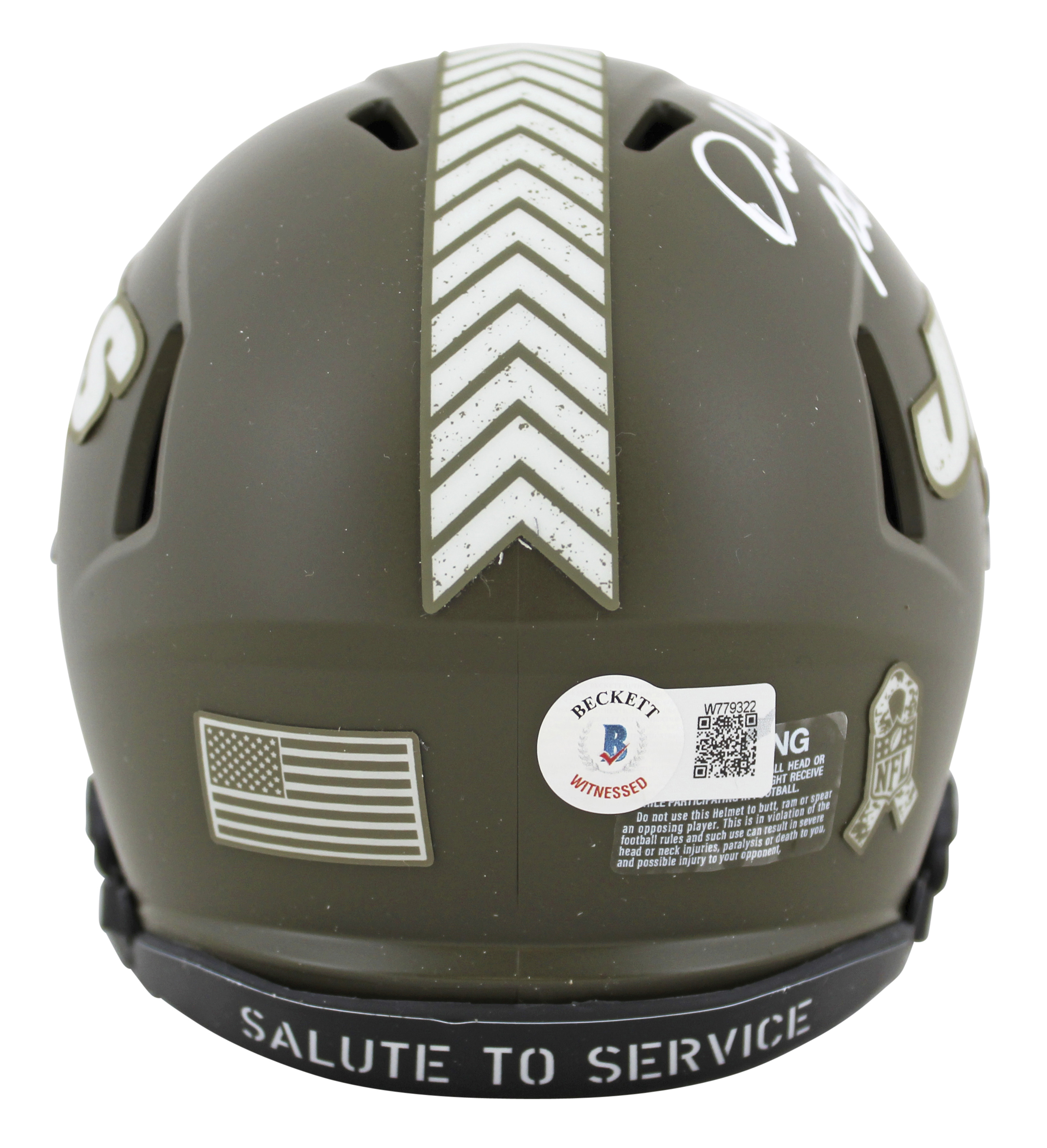 This Autographed Alternate Salute To Service Speed Mini Helmet has been Personally Signed by Darrelle Revis of the New York Jets. This item is 100% Authentic to include a hologram by Beckett Authentication Services. This item will come with an affixed Beckett Authentication Services (BAS) authentication sticker, which includes a scannable QR code to verify authenticity. Please note that Beckett no longer provides serial-numbered COA cards, and the attached BAS sticker will serve as the complete authentication for this item. This is a BAS Witnessed Protection Program item which means a Beckett Authentication Service representative was present when this item was being signed. We conducted an autograph signing with Darrelle Revis where multiples of the same item were signed. While the photographs are representative of this item, the size, placement and strength of the signature may vary. Each item is hand signed, therefore, each autograph is unique. This item can be verified through BAS Witnessed.