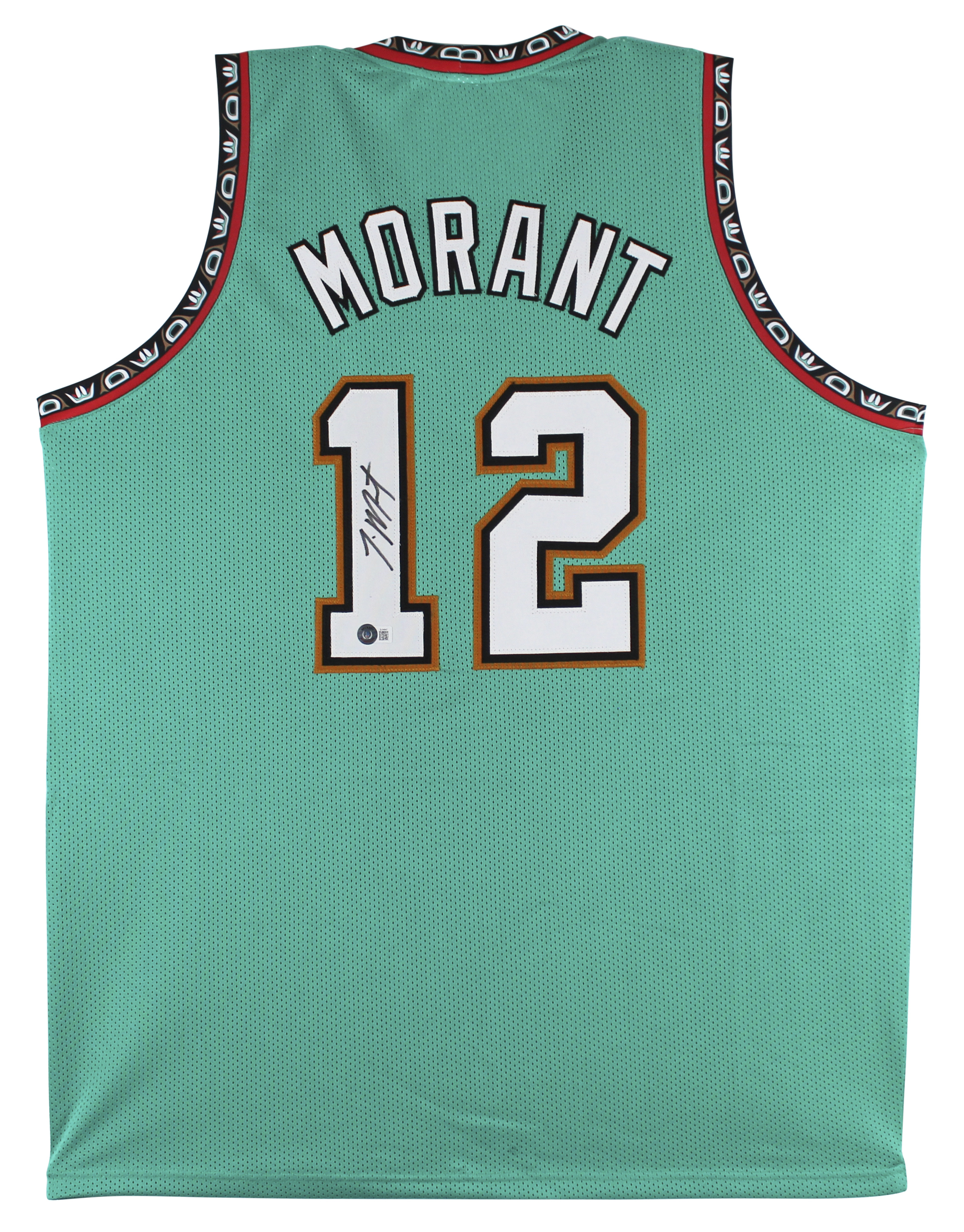 This Autographed Teal Throwback Pro Style Jersey has been Personally Signed by Ja Morant of the Memphis Grizzlies. This item is 100% Authentic to include a hologram by Beckett Authentication Services. This item will come with an affixed Beckett Authentication Services (BAS) authentication sticker, which includes a scannable QR code to verify authenticity. Please note that Beckett no longer provides serial-numbered COA cards, and the attached BAS sticker will serve as the complete authentication for this item. We have multiples of this same item. While the photographs are representative of this item, the size, placement and strength of the signature may vary. Each item is hand signed, therefore, each autograph is unique. This is a X-Large sized, non-branded, custom-stitched Jersey.