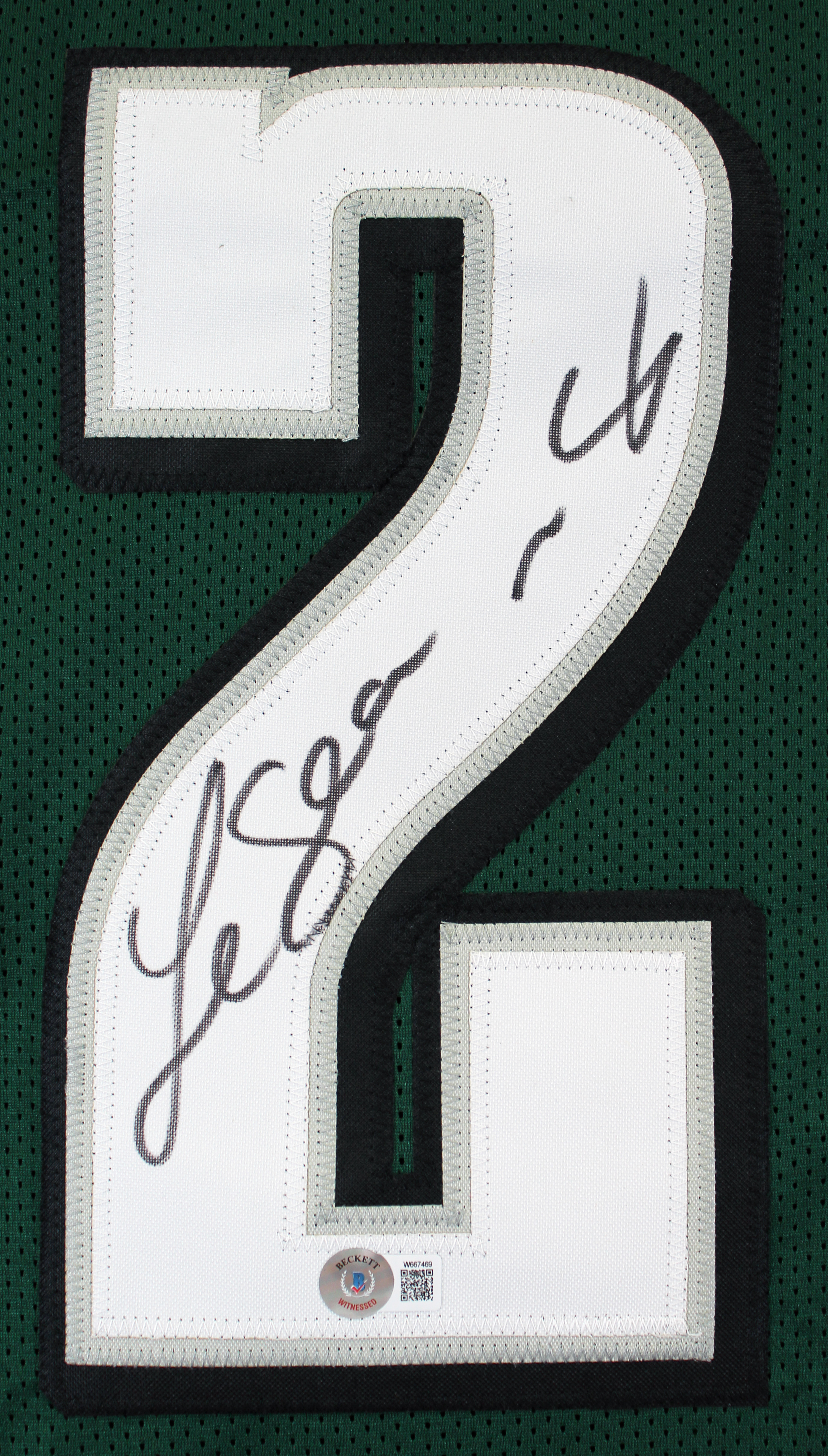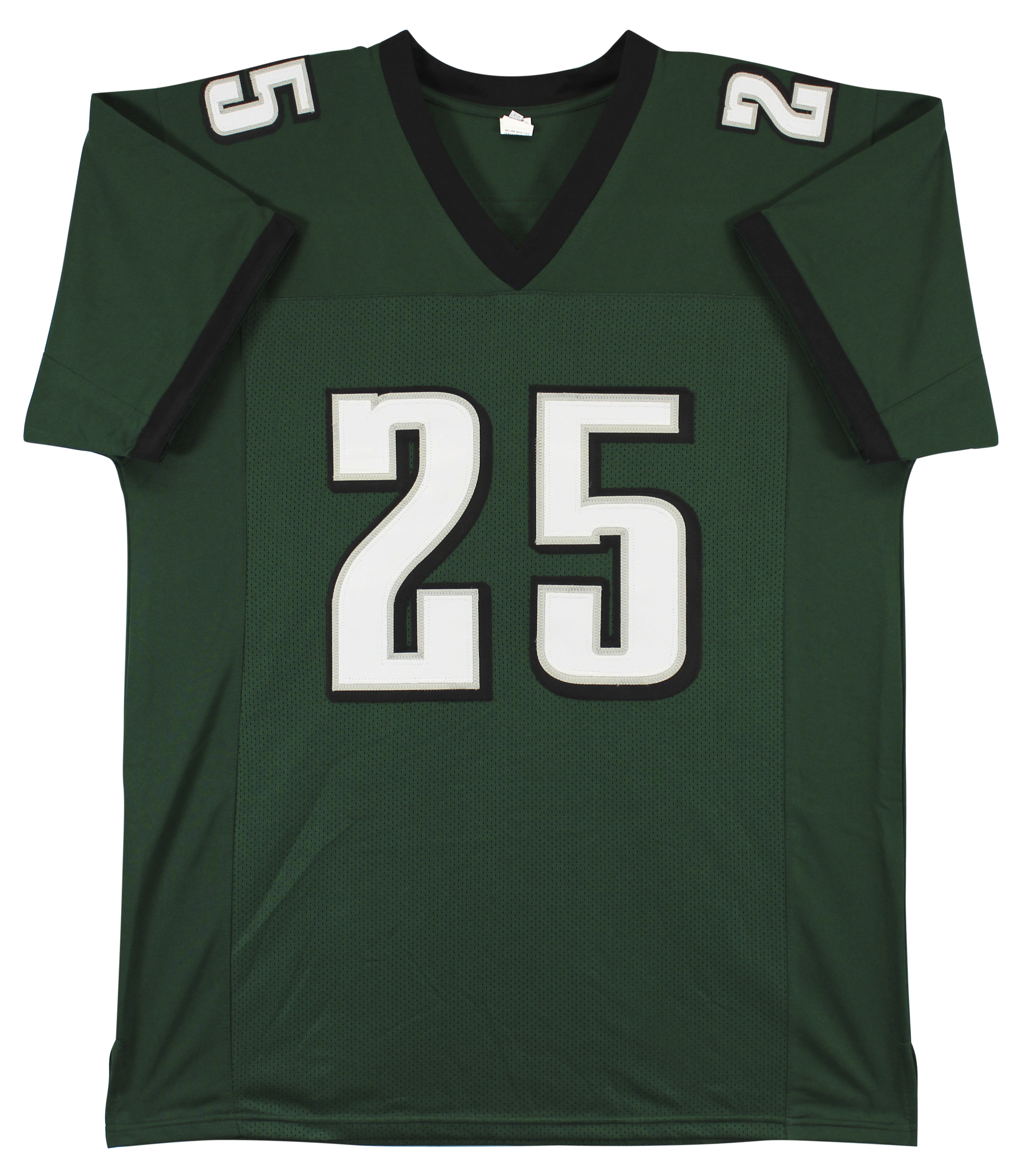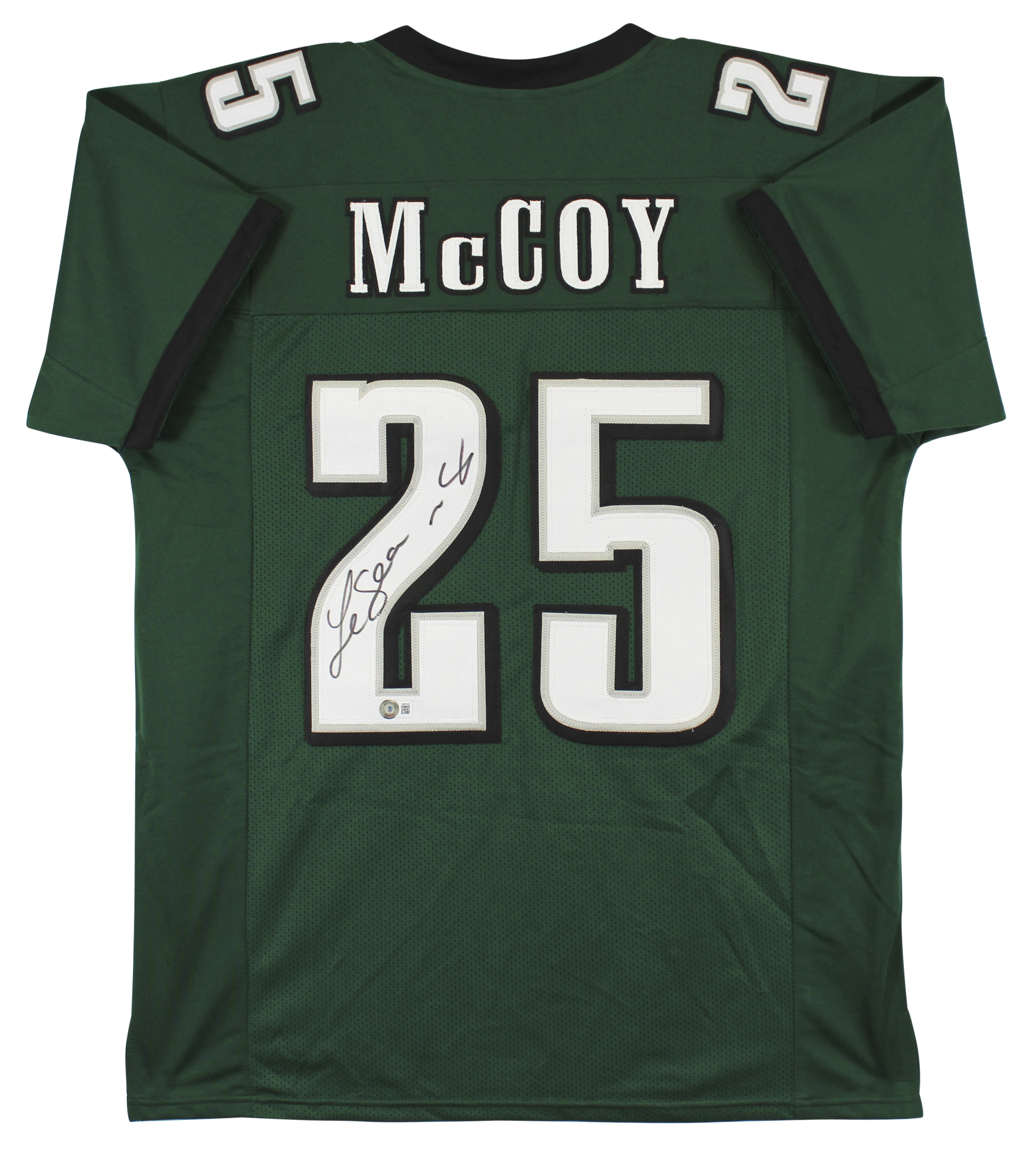 This Autographed Green Pro Style Jersey has been Personally Signed by LeSean McCoy of the Philadelphia Eagles. This item is 100% Authentic to include a hologram by Beckett Authentication Services. This item will come with an affixed Beckett Authentication Services (BAS) authentication sticker, which includes a scannable QR code to verify authenticity. Please note that Beckett no longer provides serial-numbered COA cards, and the attached BAS sticker will serve as the complete authentication for this item. This is a BAS Witnessed Protection Program item which means a Beckett Authentication Service representative was present when this item was being signed. We conducted an autograph signing with LeSean McCoy where multiples of the same item were signed. While the photographs are representative of this item, the size, placement and strength of the signature may vary. Each item is hand signed, therefore, each autograph is unique. This item can be verified through BAS Witnessed. This is a X-Large sized, non-branded, custom-stitched Jersey.