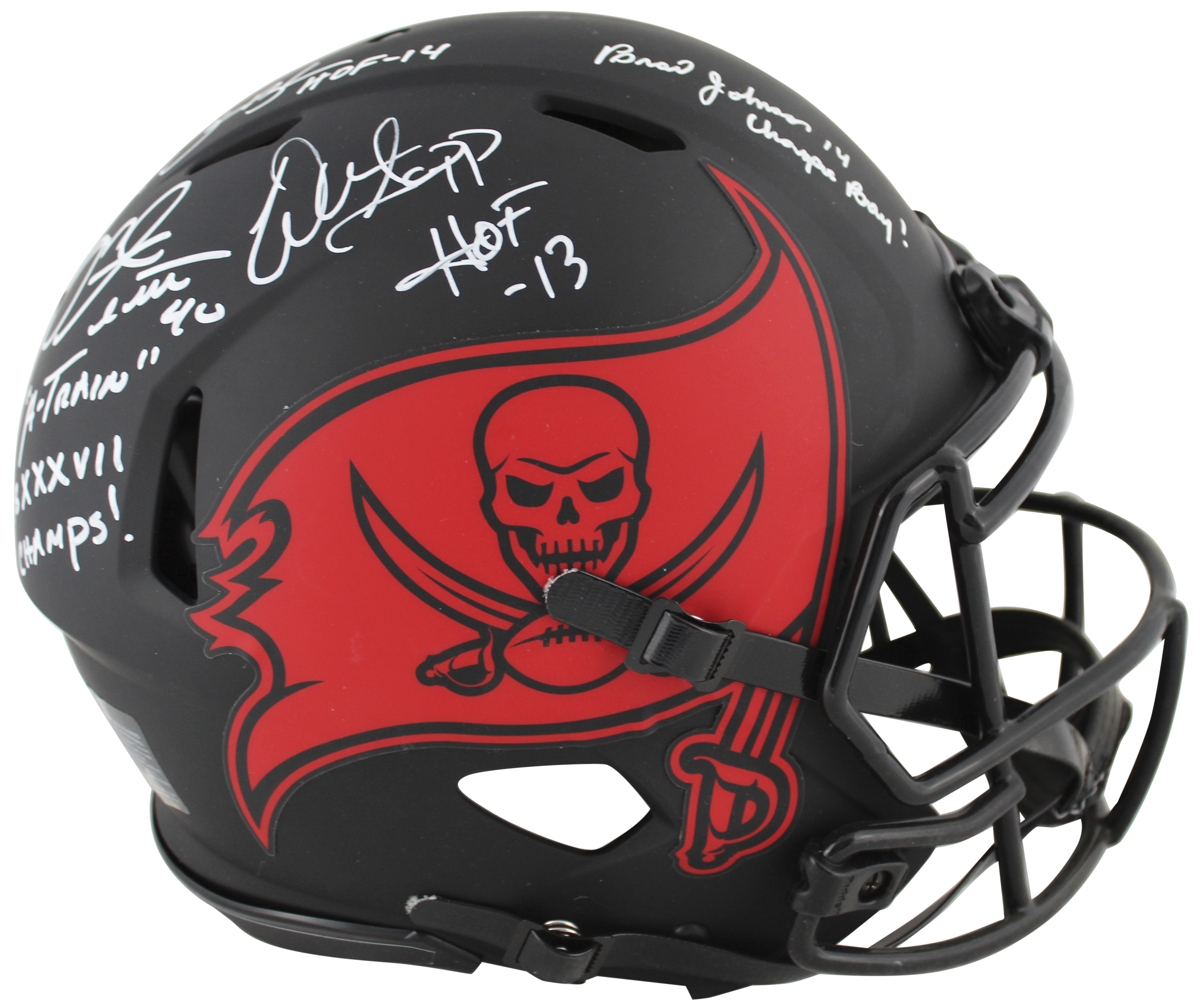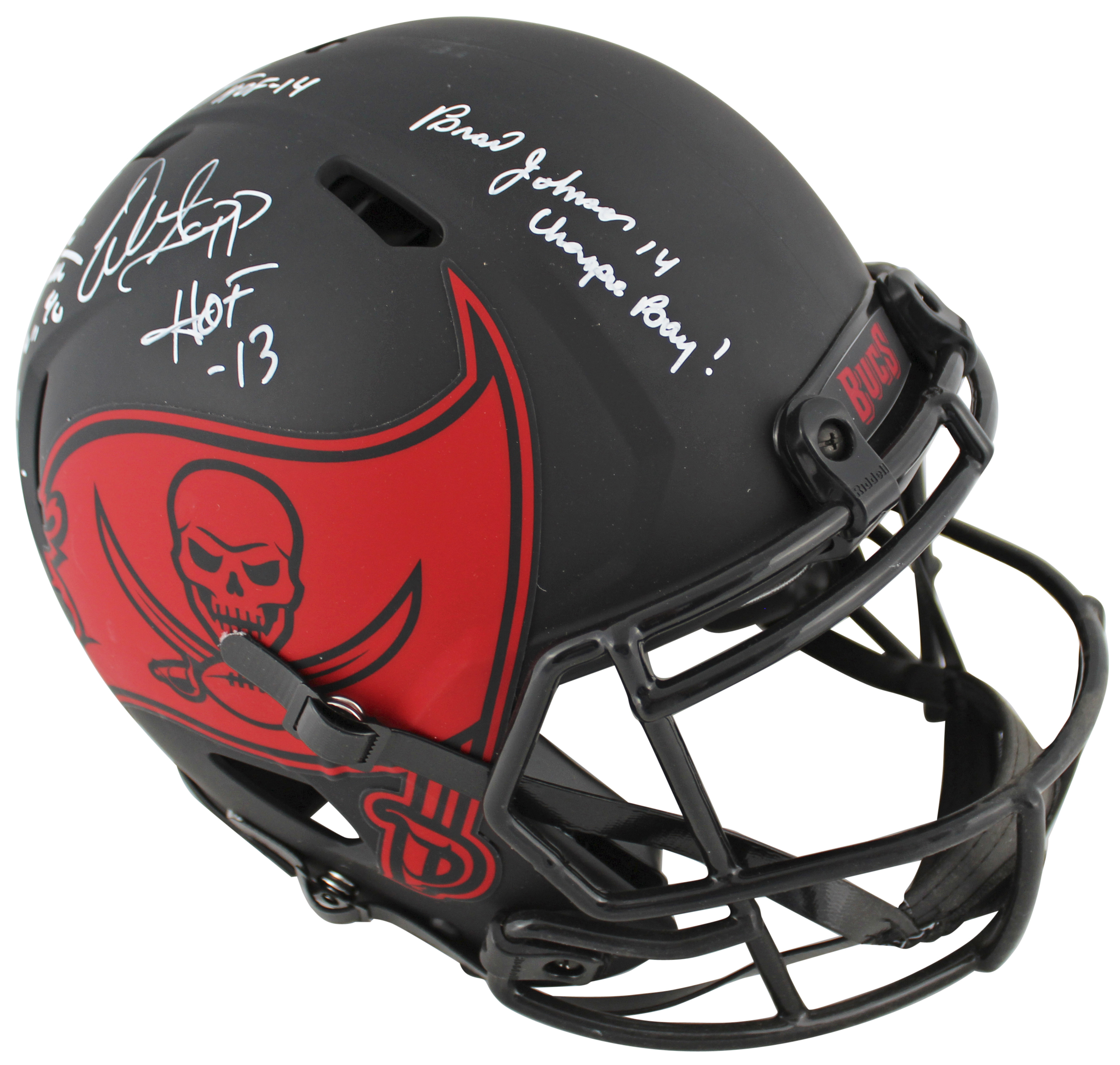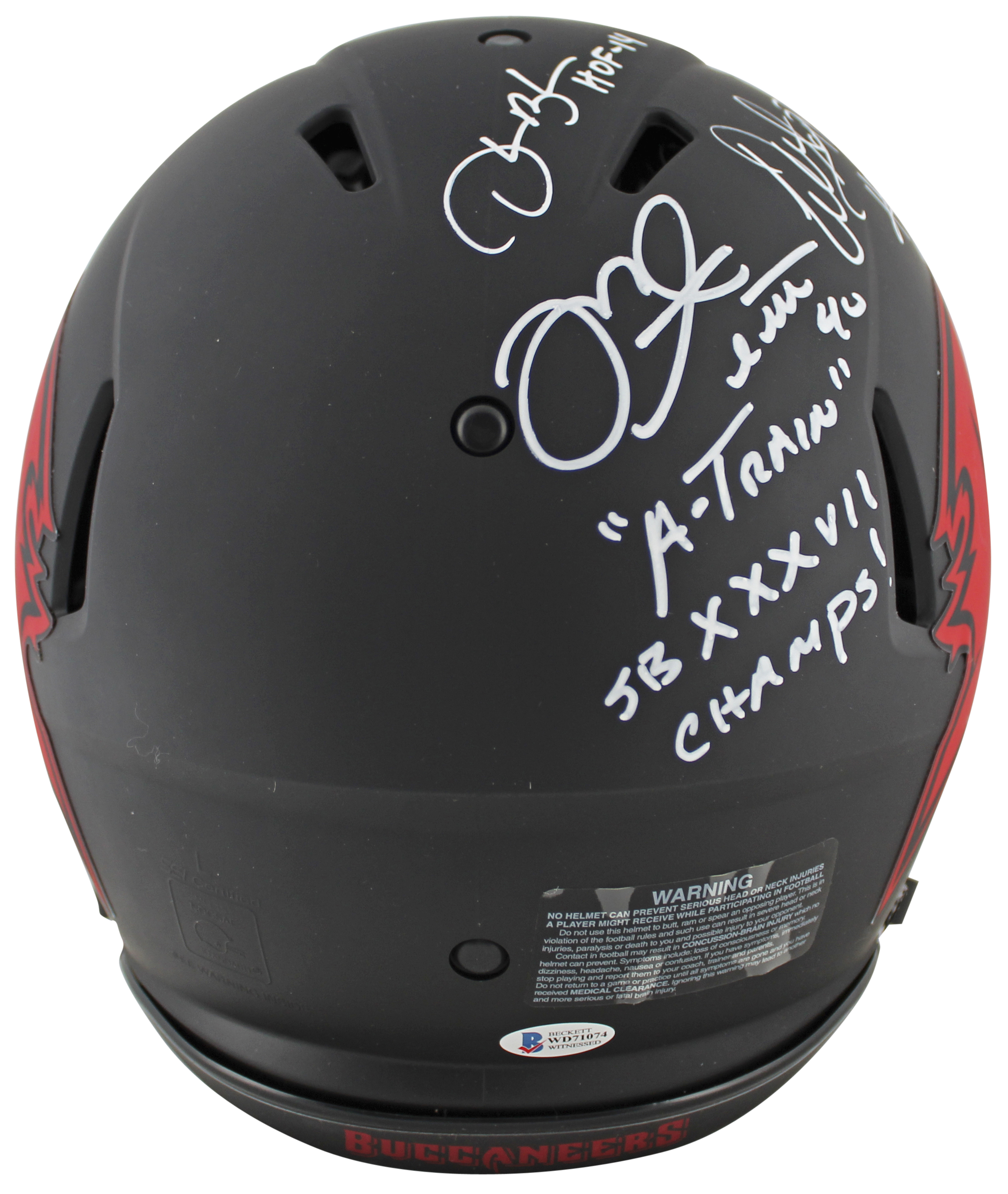 This Autographed Alternate Eclipse Riddell Authentic Full Size Speed Proline Helmet with the inscription of "A-Train SB XXXVII Champs! (Alstott), HOF 14 (Brooks), QB Killa (Sapp), Champa Bay (Johnson)" has been Personally Signed by Warren Sapp, Derrick Brooks, Mike Alstott & Brad Johnson of the Tampa Bay Buccaneers. This item is 100% Authentic to include a hologram by Beckett Authentication Services. This item will come with the new Beckett Authentication hologram that has a scannable QR code rather than the traditional COA. If you would like to have a COA, you are welcome to reach out to Beckett for a printed certification once you receive your item. This is a BAS Witnessed Protection Program item which means a Beckett Authentication Service representative was present when this item was being signed. The authenticity can be verified on Beckett Authentication Services website.