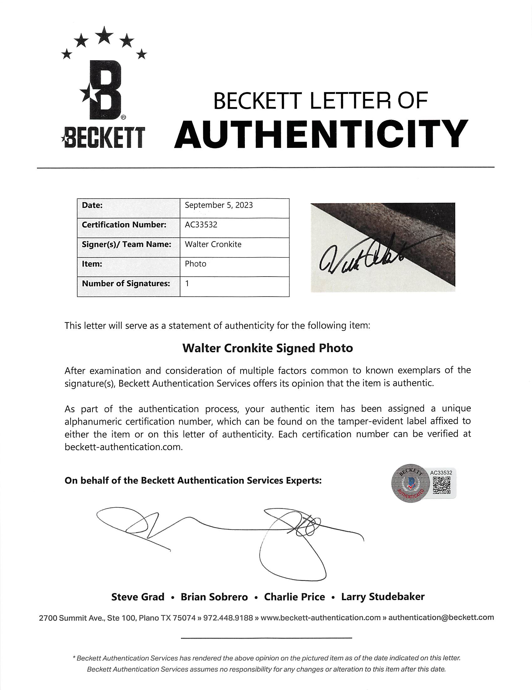 This Autographed 7x9 Black & White Photo has been Personally Signed by Walter Cronkite. This item is 100% Authentic to include a Certificate of Authenticity (COA) / hologram by Beckett Authentication Services. The authenticity can be verified on Beckett Authentication Services website.