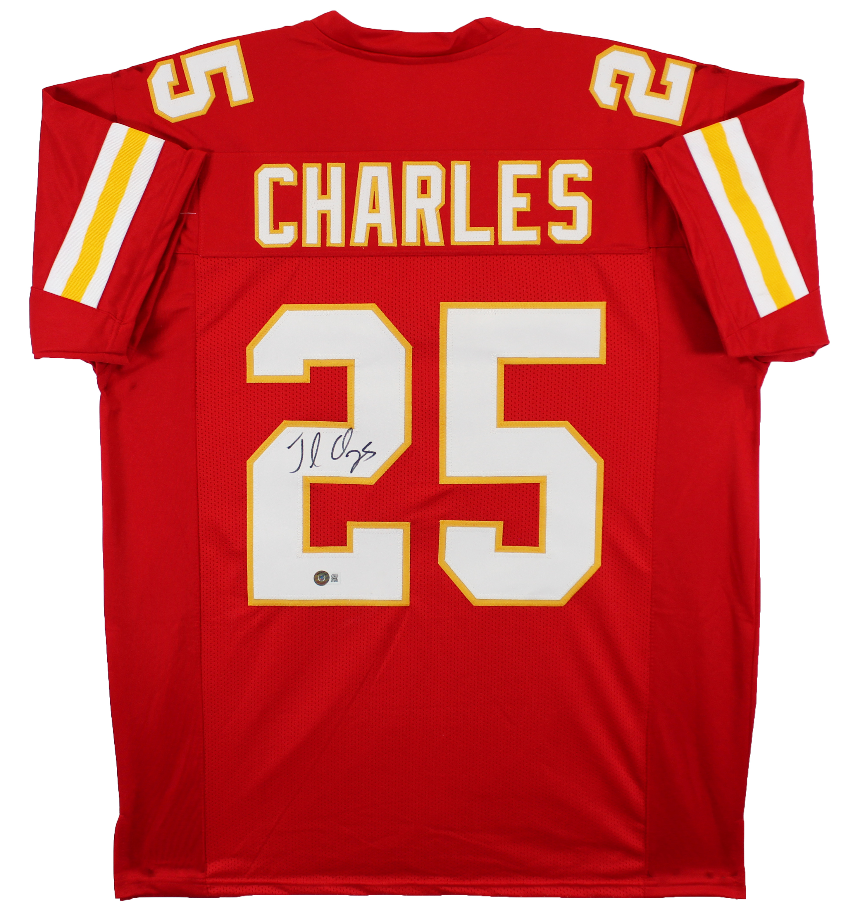 This Autographed Red Pro Style Jersey has been Personally Signed by Jamaal Charles of the Kansas City Chiefs. This item is 100% Authentic to include a hologram by Beckett Authentication Services. This item will come with an affixed Beckett Authentication Services (BAS) authentication sticker, which includes a scannable QR code to verify authenticity. Please note that Beckett no longer provides serial-numbered COA cards, and the attached BAS sticker will serve as the complete authentication for this item. This is a BAS Witnessed Protection Program item which means a Beckett Authentication Service representative was present when this item was being signed. We conducted an autograph signing with Jamaal Charles where multiples of the same item were signed. While the photographs are representative of this item, the size, placement and strength of the signature may vary. Each item is hand signed, therefore, each autograph is unique. This item can be verified through BAS Witnessed. This is a X-Large sized, non-branded, custom-stitched Jersey.