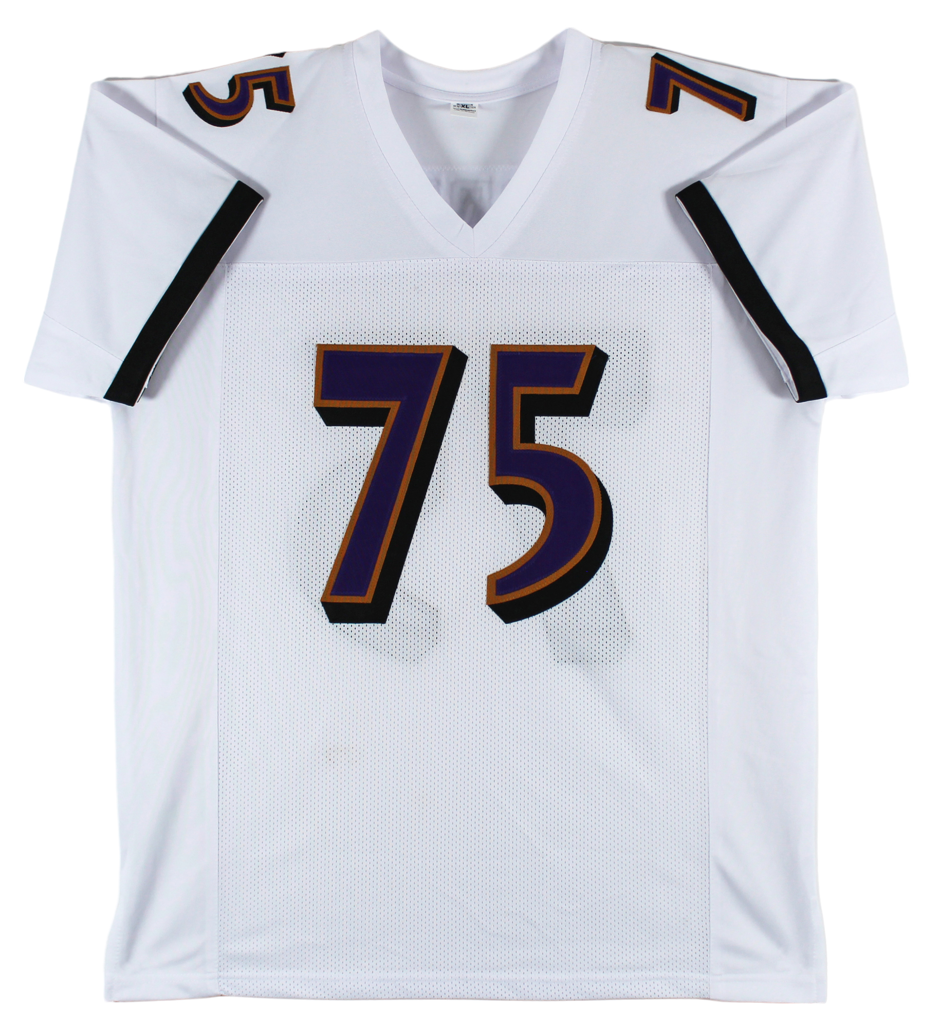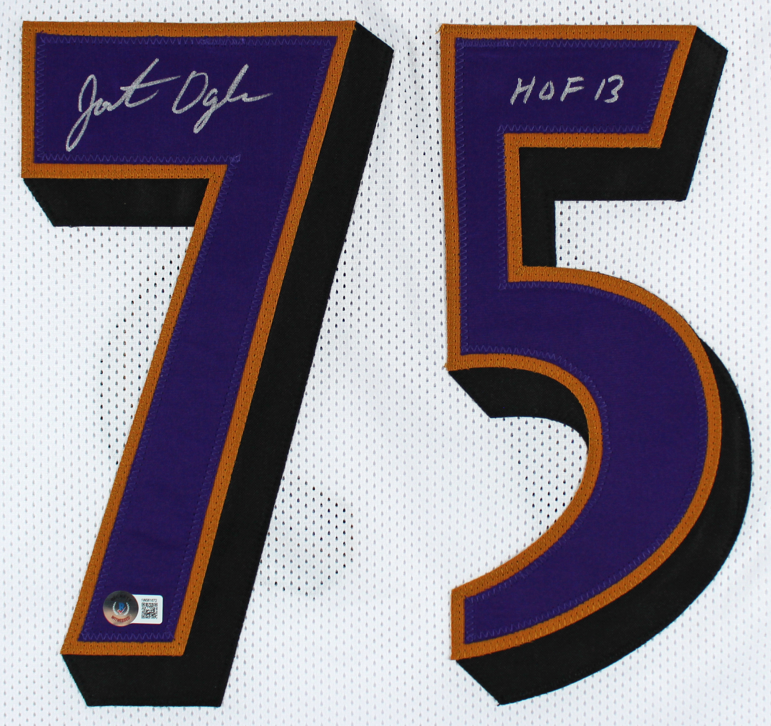 This Autographed White Pro Style Jersey with the inscription of "HOF 13" has been Personally Signed by Jonathan Ogden of the Baltimore Ravens. This item is 100% Authentic to include a hologram by Beckett Authentication Services. This item will come with an affixed Beckett Authentication Services (BAS) authentication sticker, which includes a scannable QR code to verify authenticity. Please note that Beckett no longer provides serial-numbered COA cards, and the attached BAS sticker will serve as the complete authentication for this item. This is a BAS Witnessed Protection Program item which means a Beckett Authentication Service representative was present when this item was being signed. We conducted an autograph signing with Jonathan Ogden where multiples of the same item were signed. While the photographs are representative of this item, the size, placement and strength of the signature may vary. Each item is hand signed, therefore, each autograph is unique. This item can be verified through BAS Witnessed. This is a X-Large sized, non-branded, custom-stitched Jersey.
