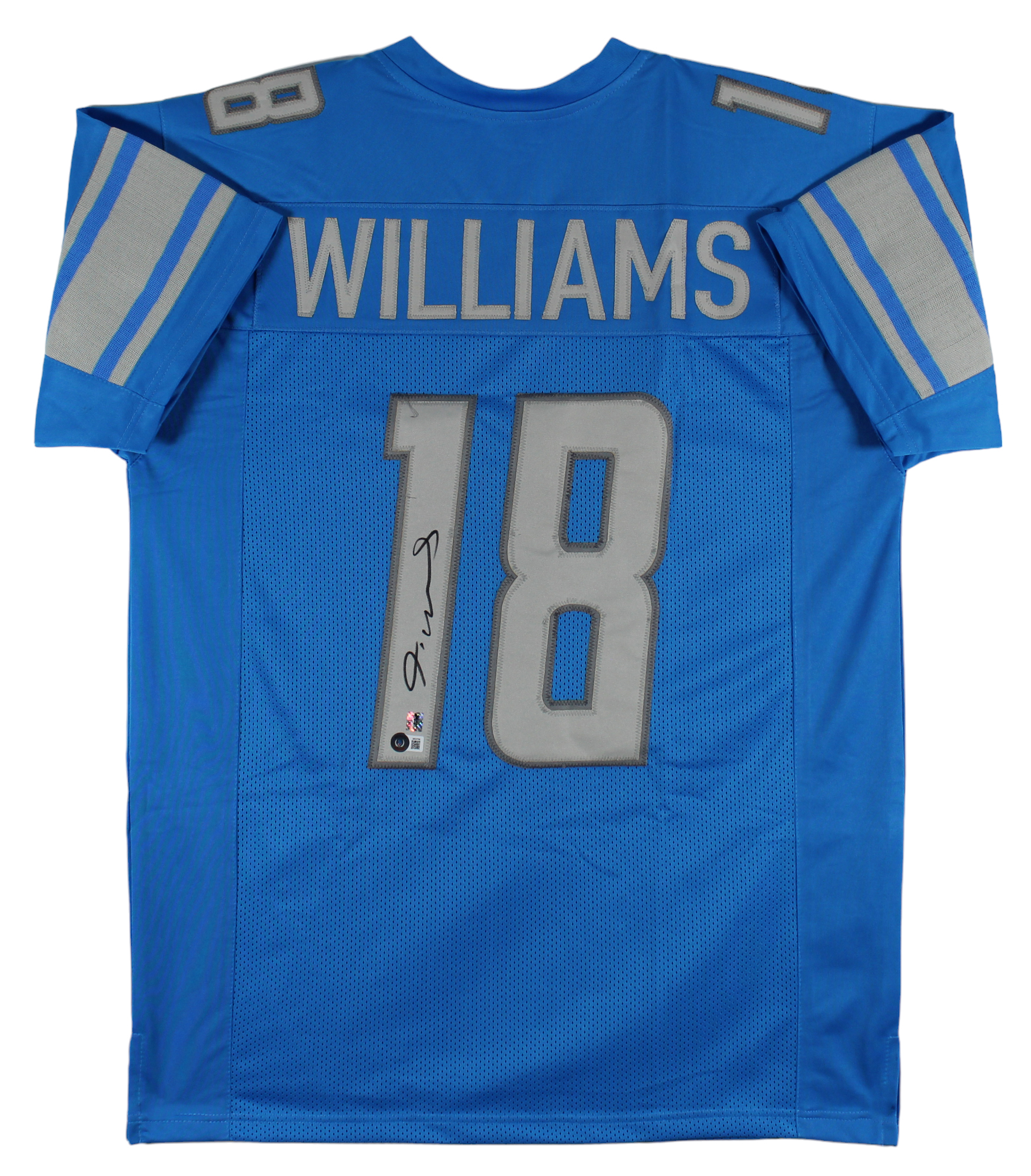 This Autographed Blue Pro Style Jersey has been Personally Signed by Jameson Williams of the Detroit Lions. This item is 100% Authentic to include a hologram by Beckett Authentication Services. This item may come with the new Beckett Authentication hologram that has a scannable QR code rather than the traditional COA. If you would like to have a COA, you are welcome to reach out to Beckett for a printed certification once you receive your item. This is a BAS Witnessed Protection Program item which means a Beckett Authentication Service representative was present when this item was being signed. We conducted an autograph signing with Jameson Williams where multiples of the same item were signed. While the photographs are representative of this item, the size, placement and strength of the signature may vary. Each item is hand signed, therefore, each autograph is unique. This item can be verified through BAS Witnessed. This is a X-Large sized, non-branded, custom-stitched Jersey.