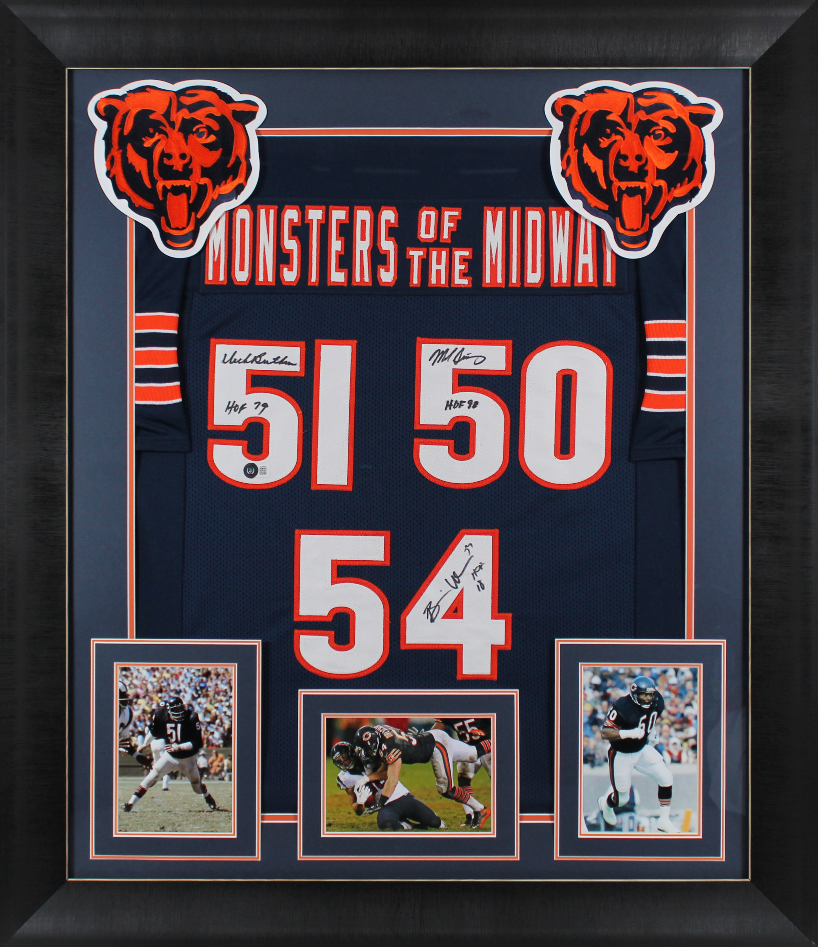 This Autographed Navy Blue Pro Style Framed Jersey with the inscription of "HOF 79 (Butkus), HOF 98 (Singletary), HOF 18 (Urlacher)" has been Personally Signed by Dick Butkus, Mike Singletary & Brian Urlacher of the Chicago Bears. This item is 100% Authentic to include a hologram by Beckett Authentication Services. This item may come with the new Beckett Authentication hologram that has a scannable QR code rather than the traditional COA. If you would like to have a COA, you are welcome to reach out to Beckett for a printed certification once you receive your item. This is a BAS Witnessed Protection Program item which means a Beckett Authentication Service representative was present when this item was being signed. We conducted an autograph signing with Dick Butkus, Mike Singletary & Brian Urlacher where multiples of the same item were signed. While the photographs are representative of this item, the size, placement and strength of the signature may vary. Each item is hand signed, therefore, each autograph is unique. This item can be verified through BAS Witnessed. This item has been professionally framed to overall dimensions of approximately 32 x 37 inches. This is a X-Large sized, non-branded, custom-stitched Framed Jersey. This jersey will be framed to order, it will take 3-4 days from purchase date for it to ship.