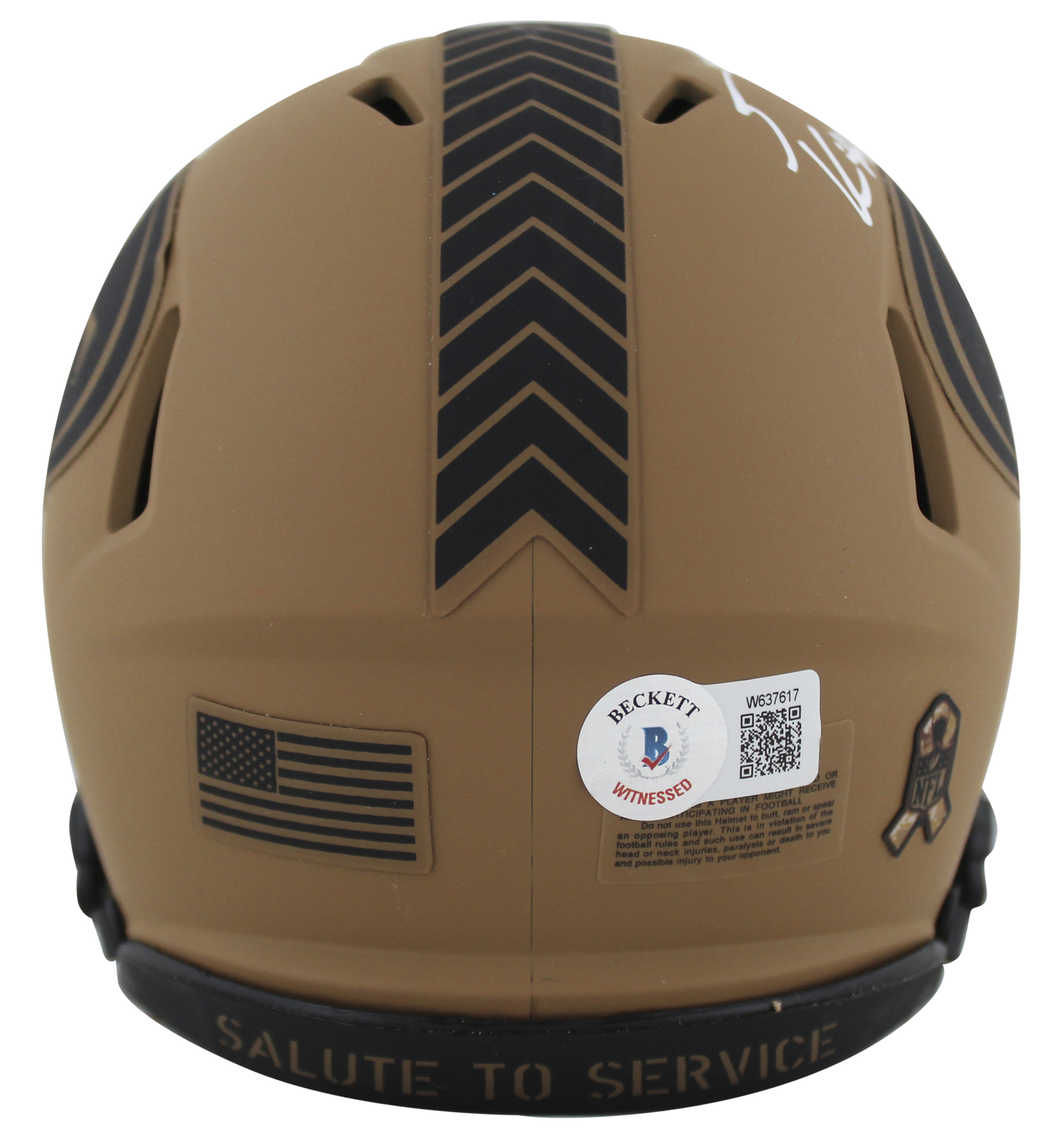 This Autographed Alternate 2023 Salute To Service II Speed Mini Helmet has been Personally Signed by George Kittle of the San Francisco 49ers. This item is 100% Authentic to include a hologram by Beckett Authentication Services. This item will come with an affixed Beckett Authentication Services (BAS) authentication sticker, which includes a scannable QR code to verify authenticity. Please note that Beckett no longer provides serial-numbered COA cards, and the attached BAS sticker will serve as the complete authentication for this item. This is a BAS Witnessed Protection Program item which means a Beckett Authentication Service representative was present when this item was being signed. We conducted an autograph signing with George Kittle where multiples of the same item were signed. While the photographs are representative of this item, the size, placement and strength of the signature may vary. Each item is hand signed, therefore, each autograph is unique. This item can be verified through BAS Witnessed.