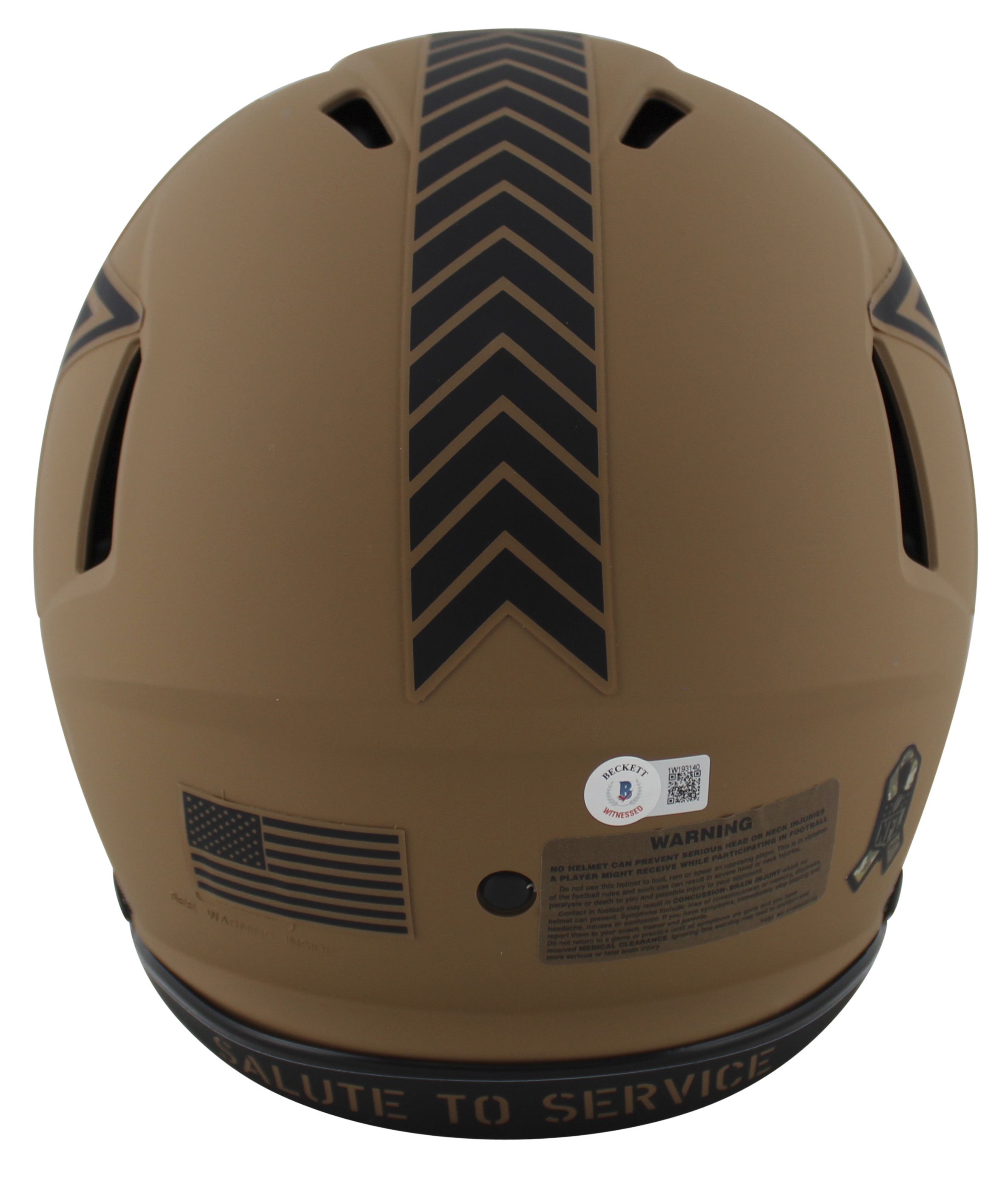 This Autographed Alternate 2023 Salute To Service II Riddell Authentic Full Size Speed Proline Helmet has been Personally Signed by Dak Prescott of the Dallas Cowboys. This item is 100% Authentic to include a hologram by Beckett Authentication Services. This item may come with the new Beckett Authentication hologram that has a scannable QR code rather than the traditional COA. If you would like to have a COA, you are welcome to reach out to Beckett for a printed certification once you receive your item. This is a BAS Witnessed Protection Program item which means a Beckett Authentication Service representative was present when this item was being signed. We conducted an autograph signing with Dak Prescott where multiples of the same item were signed. While the photographs are representative of this item, the size, placement and strength of the signature may vary. Each item is hand signed, therefore, each autograph is unique. This item can be verified through BAS Witnessed.