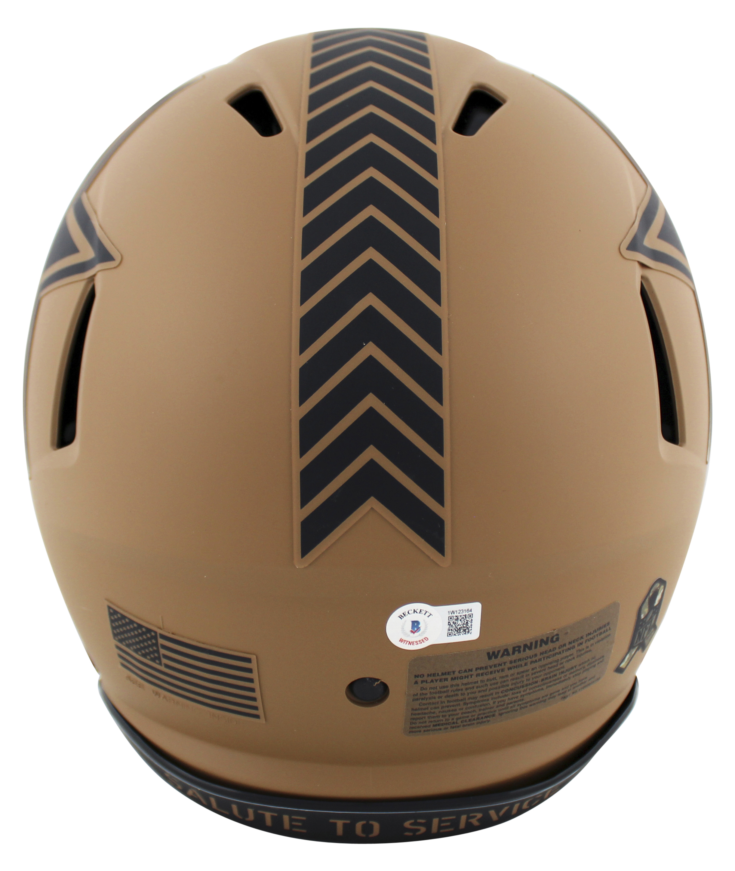 This Autographed Alternate 2023 Salute To Service II Riddell Authentic Full Size Speed Proline Helmet with the inscription of "HOF 94" has been Personally Signed by Tony Dorsett of the Dallas Cowboys. This item is 100% Authentic to include a hologram by Beckett Authentication Services. This item may come with the new Beckett Authentication hologram that has a scannable QR code rather than the traditional COA. If you would like to have a COA, you are welcome to reach out to Beckett for a printed certification once you receive your item. This is a BAS Witnessed Protection Program item which means a Beckett Authentication Service representative was present when this item was being signed. We conducted an autograph signing with Tony Dorsett where multiples of the same item were signed. While the photographs are representative of this item, the size, placement and strength of the signature may vary. Each item is hand signed, therefore, each autograph is unique. This item can be verified through BAS Witnessed.