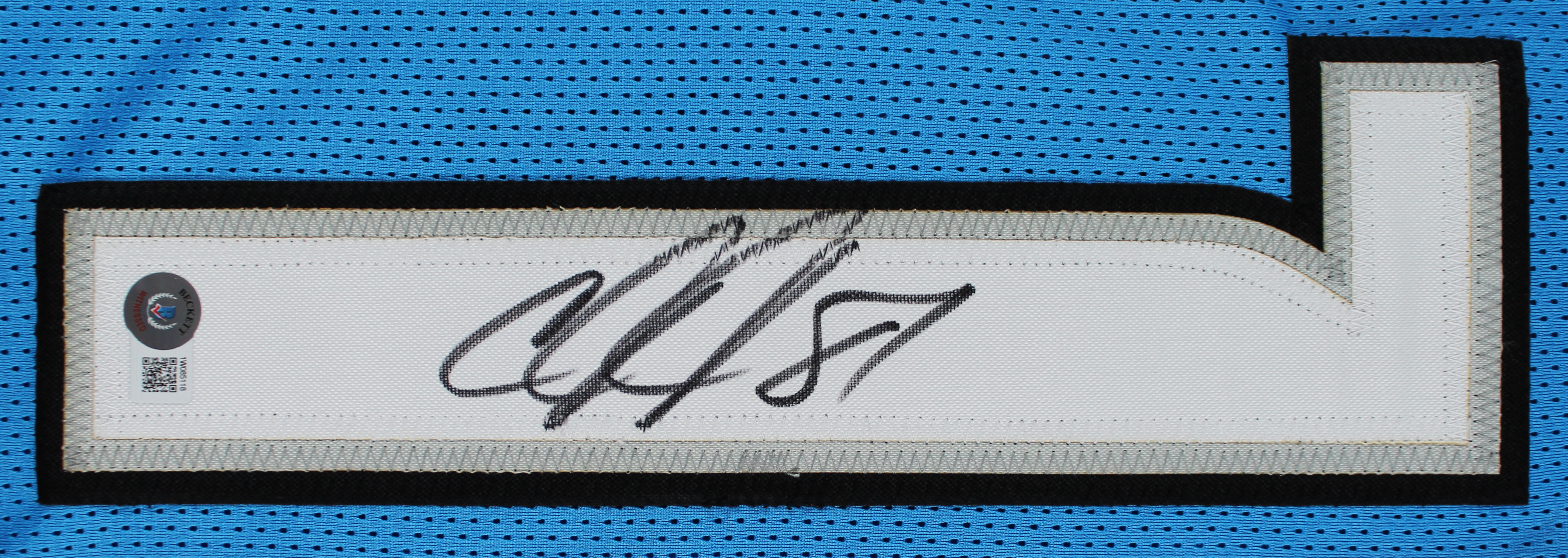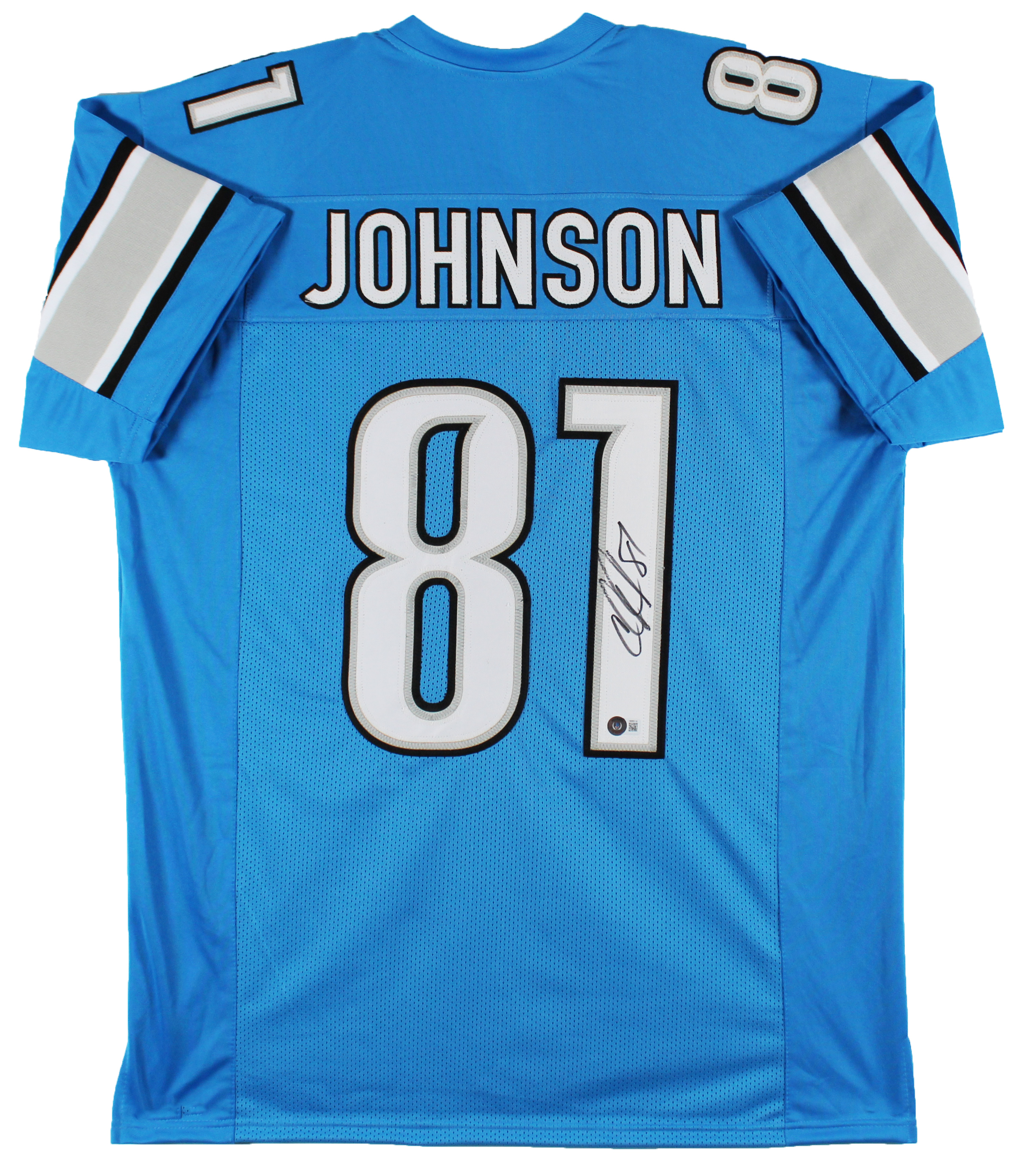 This Autographed Blue Pro Style Jersey has been Personally Signed by Calvin Johnson of the Detroit Lions. This item is 100% Authentic to include a hologram by Beckett Authentication Services. This item may come with the new Beckett Authentication hologram that has a scannable QR code rather than the traditional COA. If you would like to have a COA, you are welcome to reach out to Beckett for a printed certification once you receive your item. This is a BAS Witnessed Protection Program item which means a Beckett Authentication Service representative was present when this item was being signed. We conducted an autograph signing with Calvin Johnson where multiples of the same item were signed. While the photographs are representative of this item, the size, placement and strength of the signature may vary. Each item is hand signed, therefore, each autograph is unique. This item can be verified through BAS Witnessed. This is a X-Large sized, non-branded, custom-stitched Jersey.
