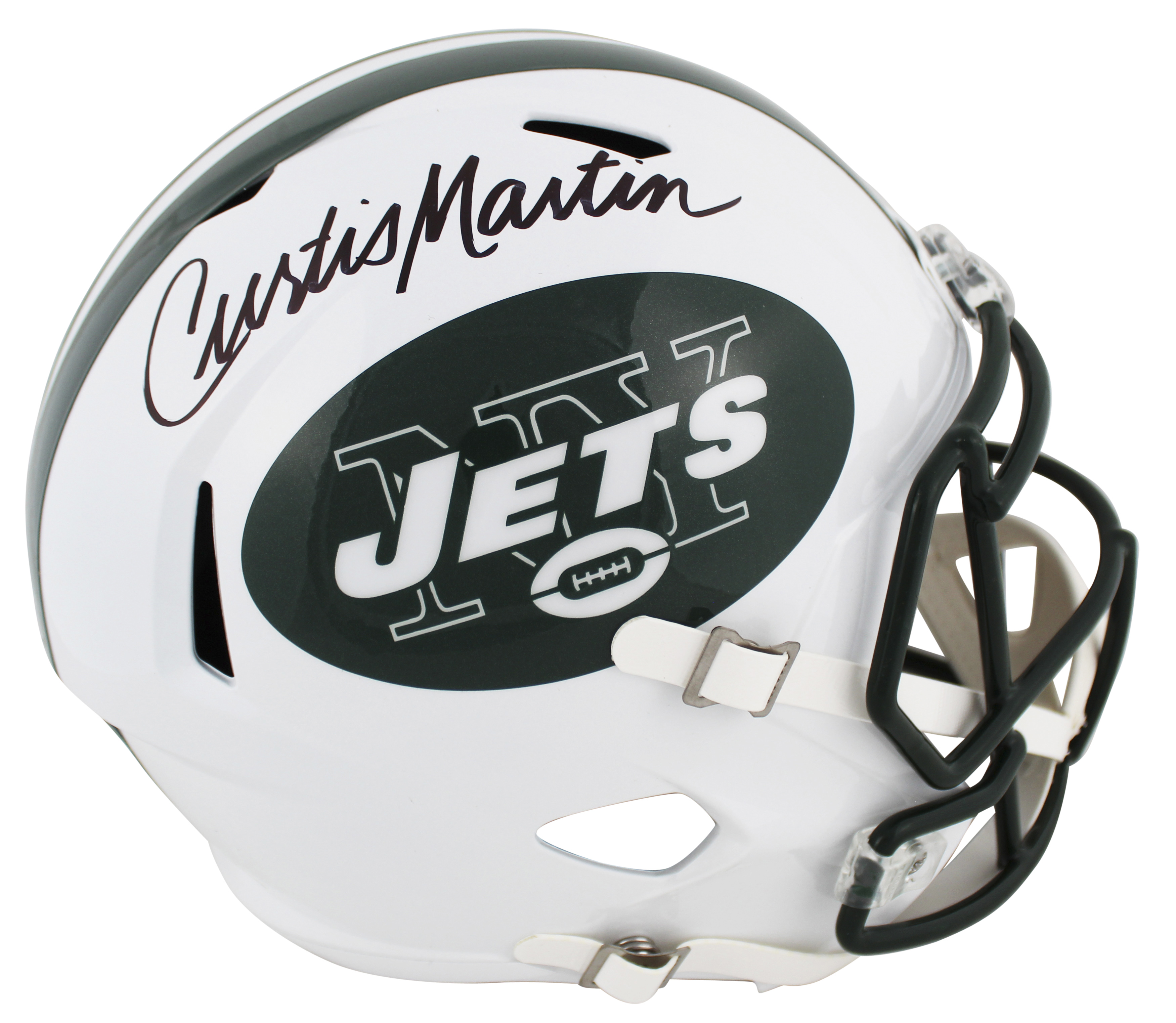This Autographed 1998-2018 Throwback Full Size Speed Rep Helmet has been Personally Signed by Curtis Martin of the New York Jets. This item is 100% Authentic and comes with a PSA/DNA Certification Card and a matching numbered Hologram. This is a PSA in the Presence Authenticated item which means a PSA representative was present when this item was being signed. We conducted an autograph signing with Curtis Martin where multiples of the same item were signed. While the photographs are representative of this item, the size, placement and strength of the signature may vary. Each item is hand signed, therefore, each autograph is unique. This item can be verified through PSA/DNA Itp.
