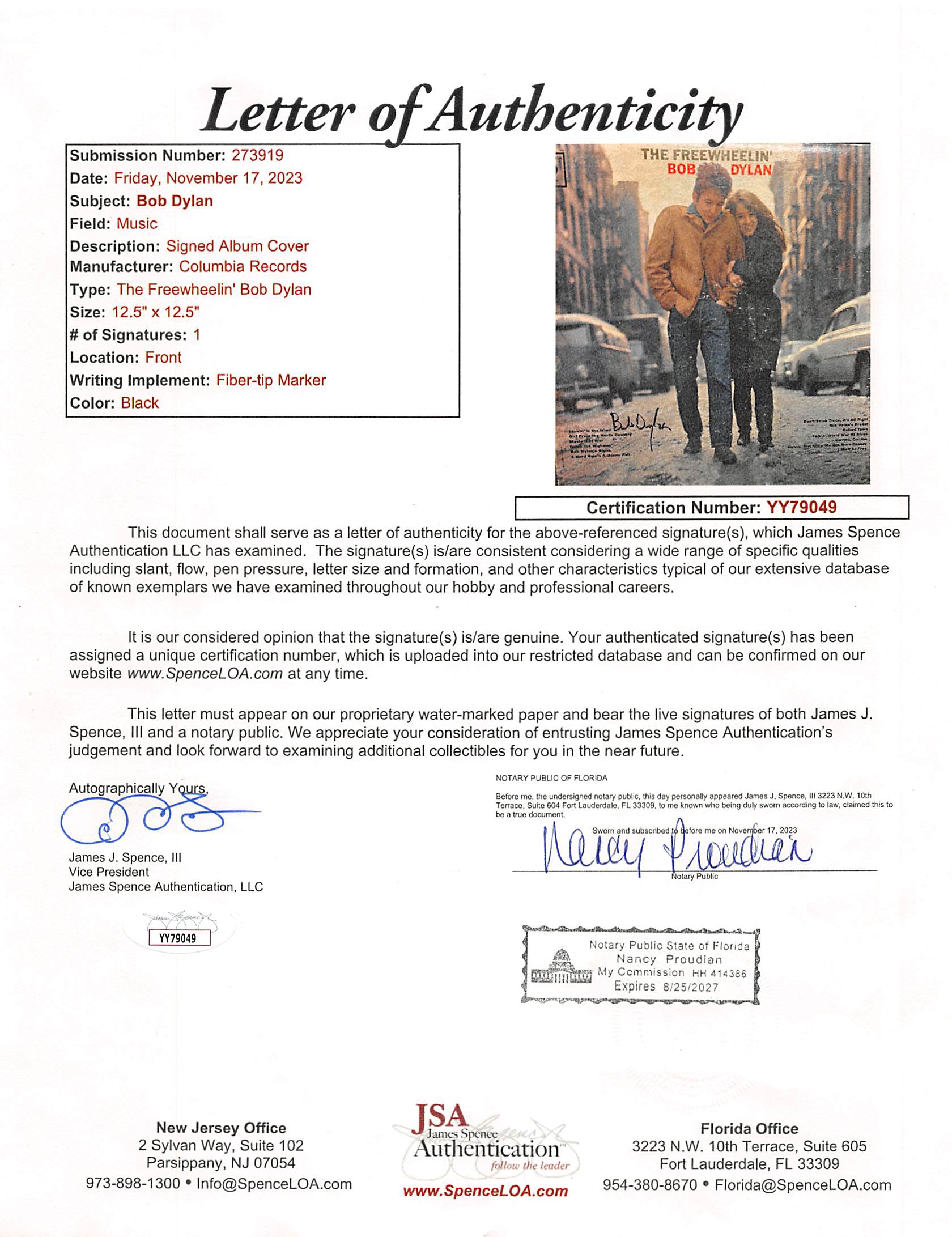 This Autographed The Freewheelin' Bob Dylan Album Cover W/ Vinyl has been Personally Signed by Bob Dylan. This item is 100% Authentic to include a Certificate of Authenticity (COA) / hologram by JSA. The authenticity can be verified on JSA website.