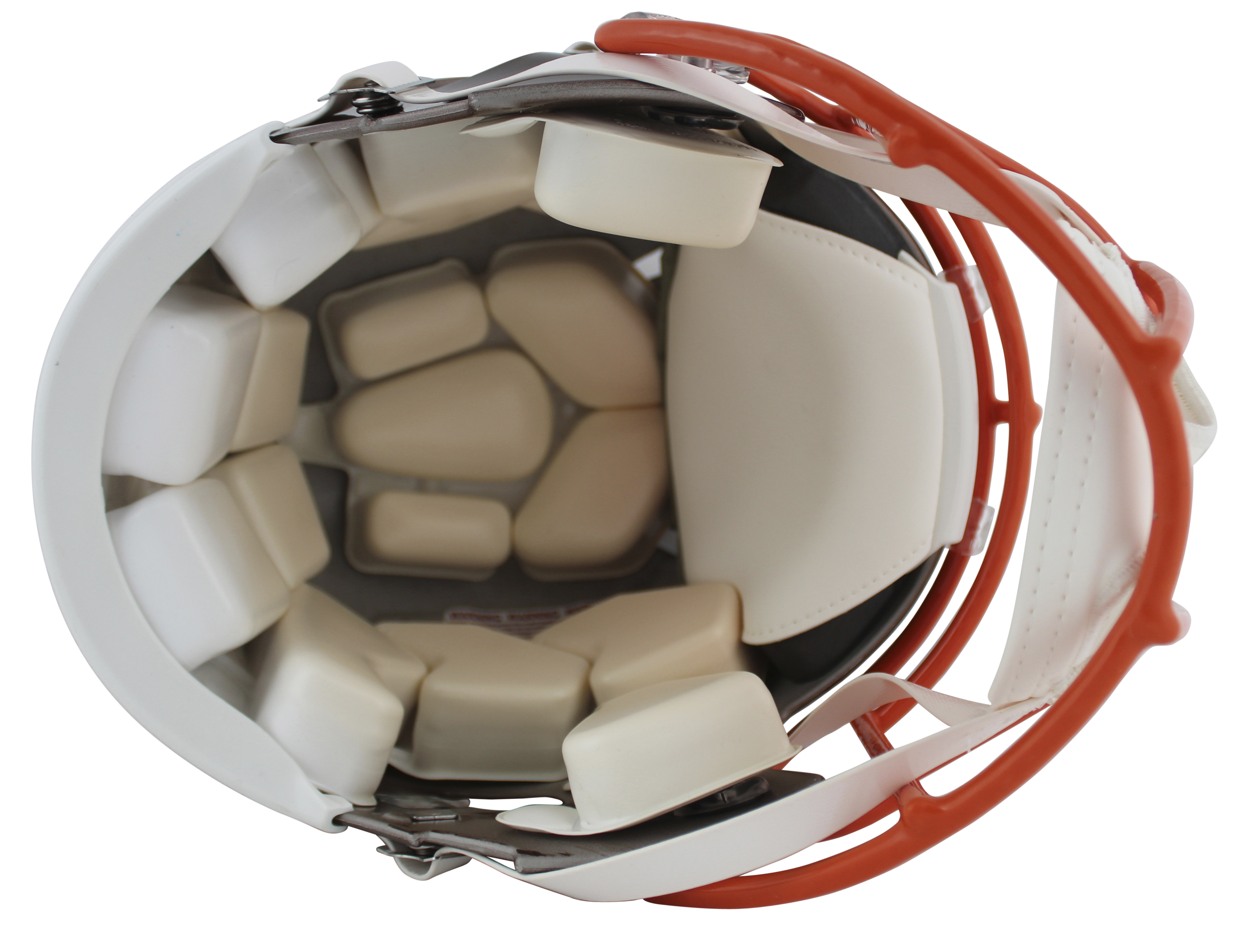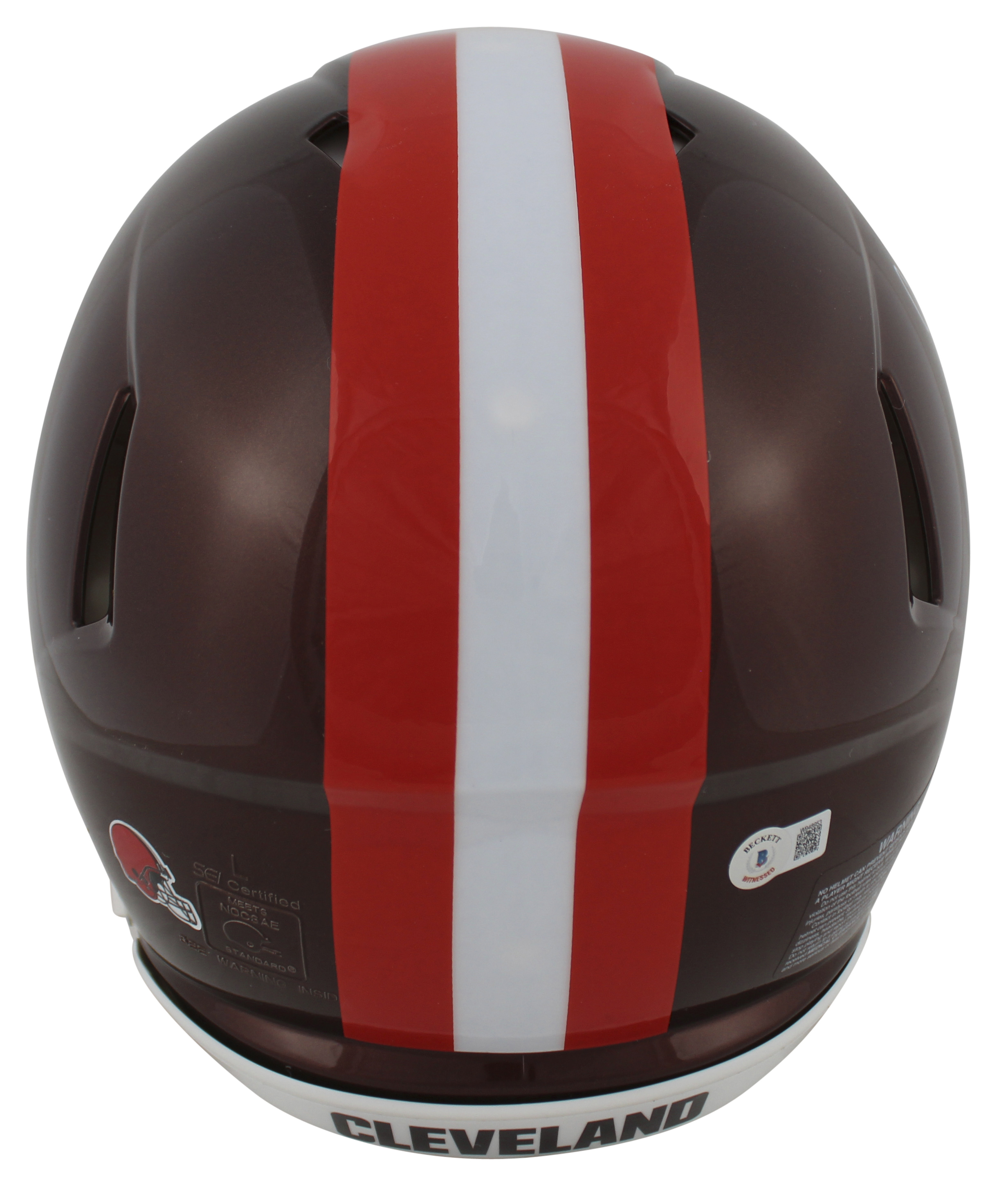 This Autographed Alternate Flash Riddell Authentic Full Size Speed Proline Helmet has been Personally Signed by Nick Chubb of the Cleveland Browns. This item is 100% Authentic to include a hologram by Beckett Authentication Services. This item may come with the new Beckett Authentication hologram that has a scannable QR code rather than the traditional COA. If you would like to have a COA, you are welcome to reach out to Beckett for a printed certification once you receive your item. This is a BAS Witnessed Protection Program item which means a Beckett Authentication Service representative was present when this item was being signed. We conducted an autograph signing with Nick Chubb where multiples of the same item were signed. While the photographs are representative of this item, the size, placement and strength of the signature may vary. Each item is hand signed, therefore, each autograph is unique. This item can be verified through BAS Witnessed.