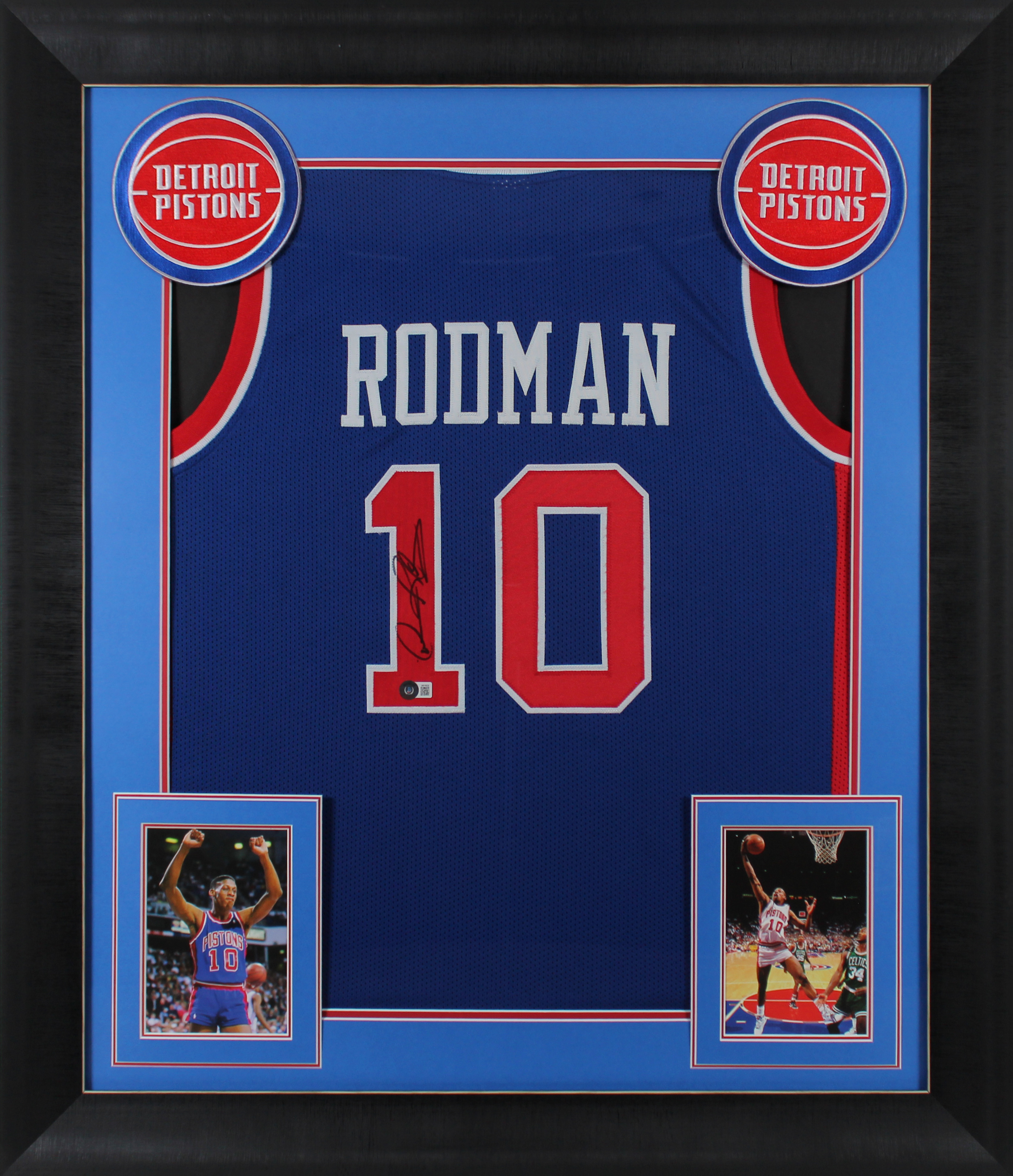 This Autographed Blue Pro Style Framed Jersey has been Personally Signed by Dennis Rodman of the Detroit Pistons. This item is 100% Authentic to include a hologram by Beckett Authentication Services. This item will come with an affixed Beckett Authentication Services (BAS) authentication sticker, which includes a scannable QR code to verify authenticity. Please note that Beckett no longer provides serial-numbered COA cards, and the attached BAS sticker will serve as the complete authentication for this item. This is a BAS Witnessed Protection Program item which means a Beckett Authentication Service representative was present when this item was being signed. We conducted an autograph signing with Dennis Rodman where multiples of the same item were signed. While the photographs are representative of this item, the size, placement and strength of the signature may vary. Each item is hand signed, therefore, each autograph is unique. This item can be verified through BAS Witnessed. This item has been professionally framed to overall dimensions of approximately 32 x 37 inches. This is a X-Large sized, non-branded, custom-stitched Framed Jersey. This jersey will be framed to order, it will take 3-4 days from purchase date for it to ship.