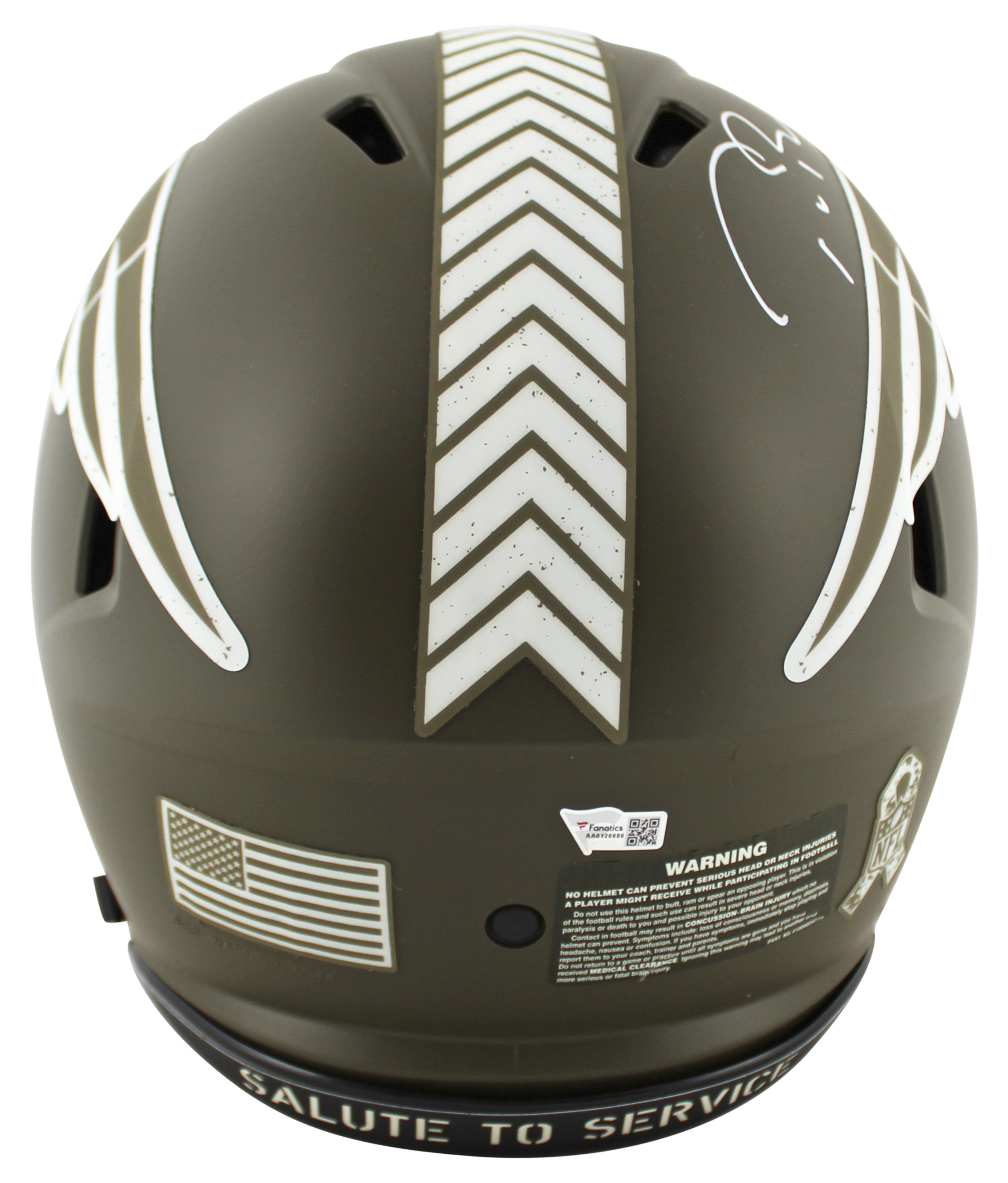 This Autographed Alternate Salute To Service Riddell Authentic Full Size Speed Proline Helmet has been Personally Signed by Tom Brady of the New England Patriots. This item is 100% Authentic to includes a numbered hologram by Fanatics. The authenticity can be verified on Fanatics website.