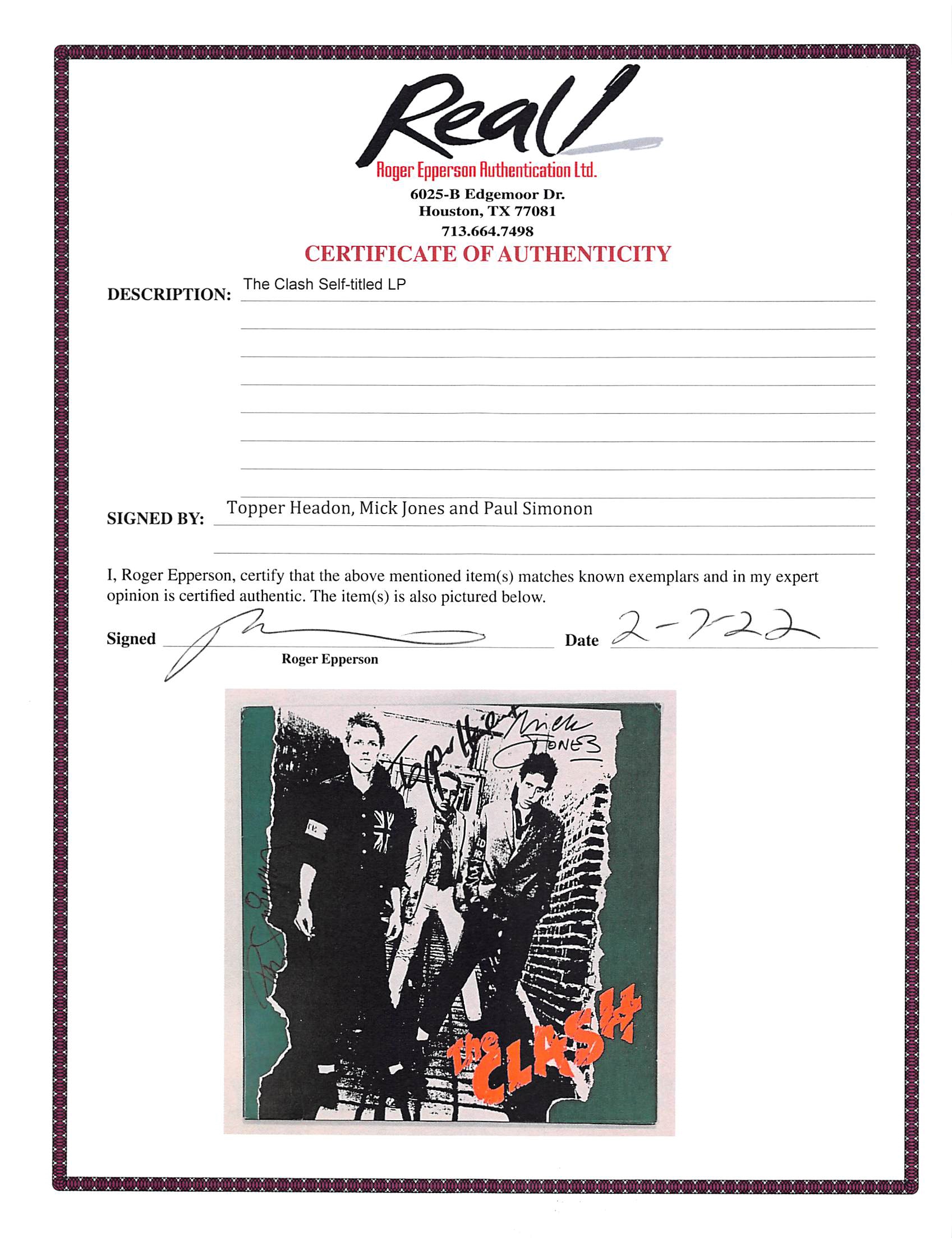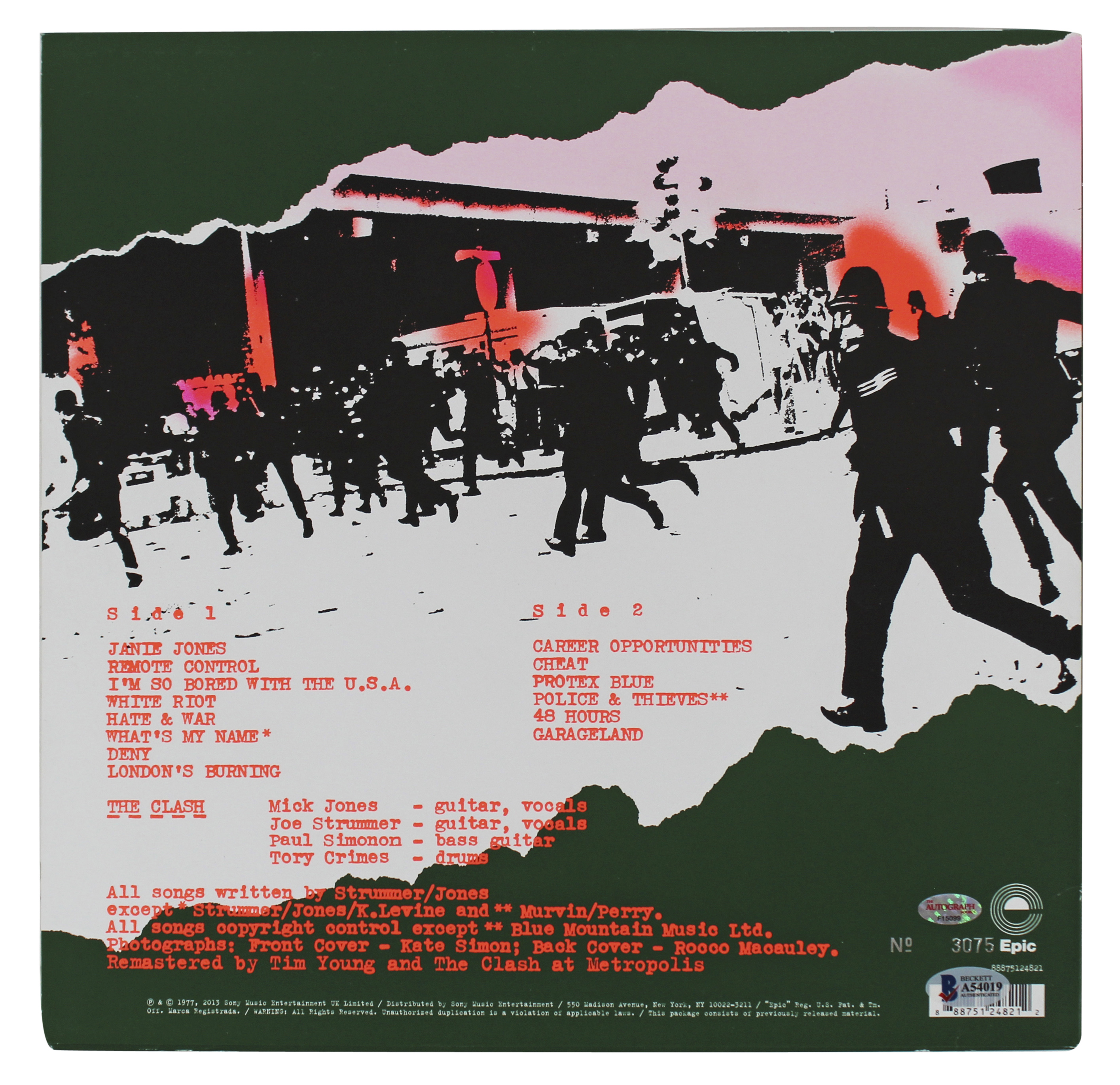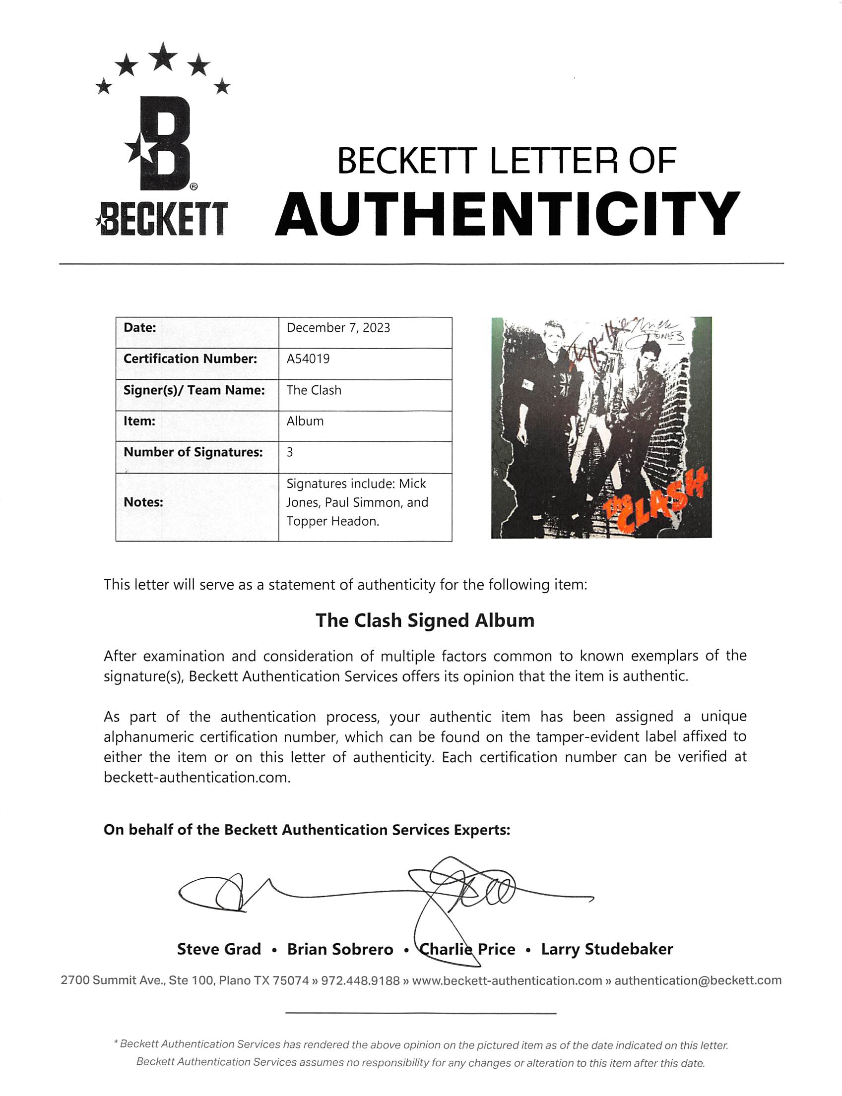 This Autographed Self Titled Album Cover (without vinyl) has been Personally Signed by Mick Jones, Paul Simmon, & Topper Headon of The Clash. This item is 100% Authentic to include a Certificate of Authenticity (COA) / hologram by Beckett Authentication Services. The authenticity can be verified on Beckett Authentication Services website.