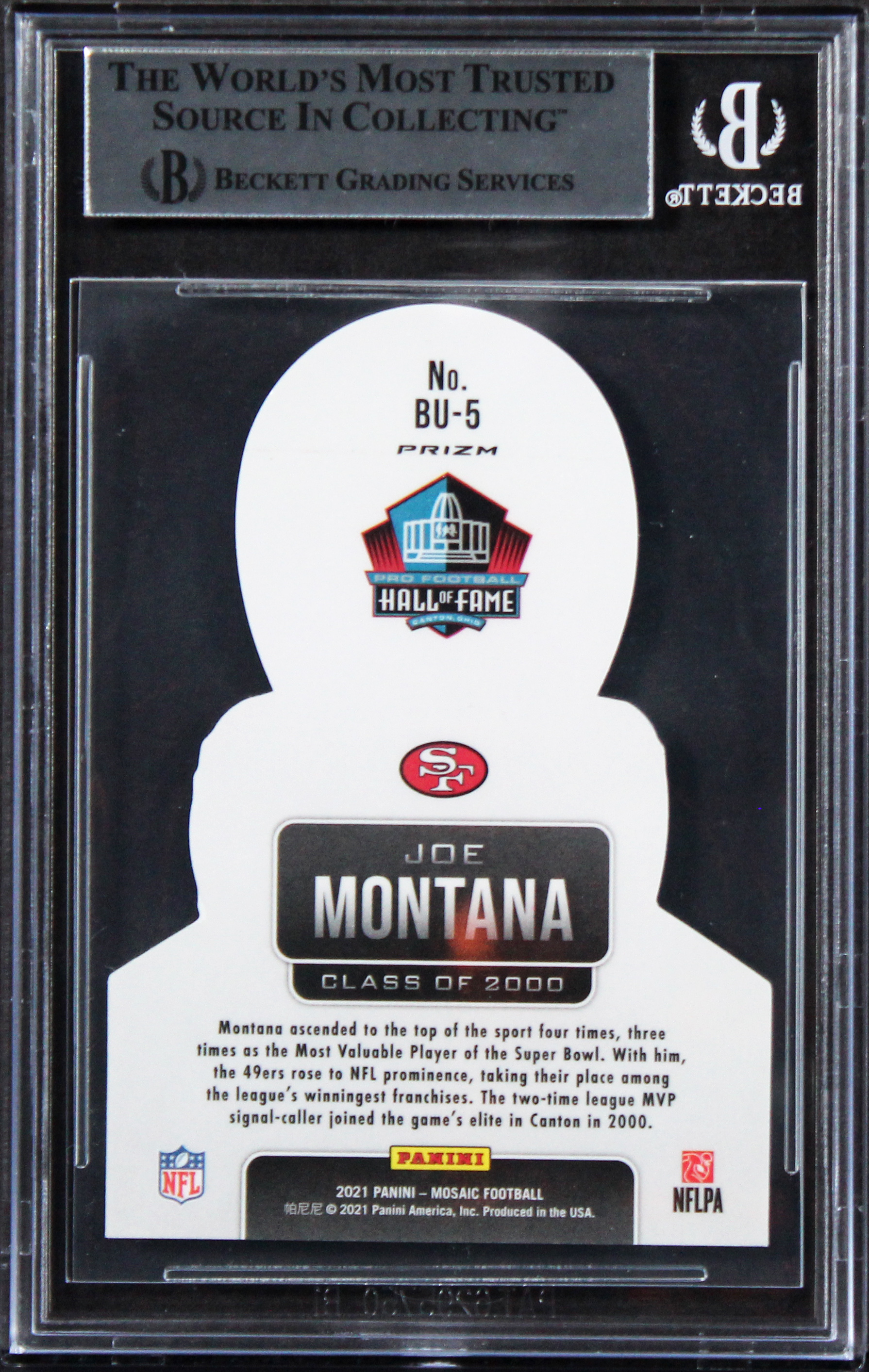 This Autographed 2021 Panini Mosaic Busted #5 Card has been Personally Signed by Joe Montana of the San Francisco 49ers. This item is 100% Authentic, it comes slabbed and authenticated by Beckett Authentication Services. The authenticity can be verified on Beckett Authentication Services website.