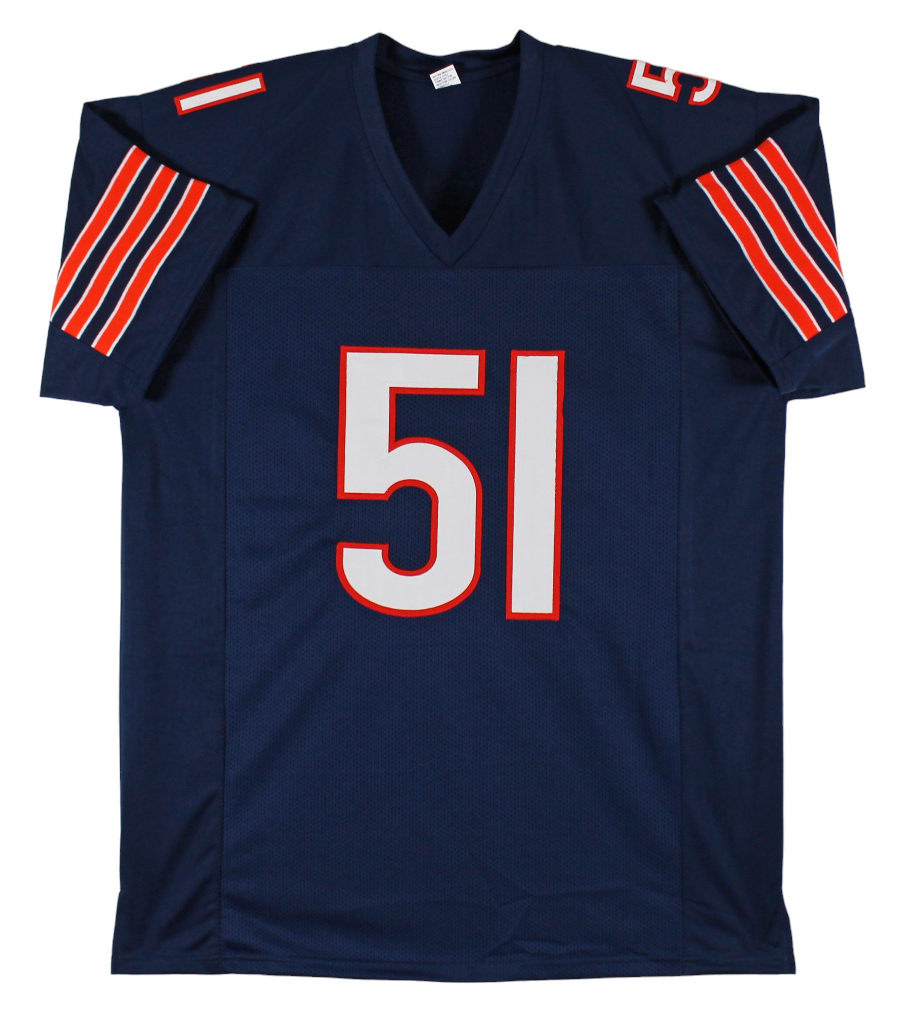 This Autographed Navy Blue Pro Style Jersey has been Personally Signed by Dick Butkus of the Chicago Bears. This item is 100% Authentic to include a hologram by Beckett Authentication Services. This item will come with an affixed Beckett Authentication Services (BAS) authentication sticker, which includes a scannable QR code to verify authenticity. Please note that Beckett no longer provides serial-numbered COA cards, and the attached BAS sticker will serve as the complete authentication for this item. We conducted an autograph signing with Dick Butkus where multiples of the same item were signed. While the photographs are representative of this item, the size, placement and strength of the signature may vary. Each item is hand signed, therefore, each autograph is unique. This item can be verified through BAS. This is a X-Large sized, non-branded, custom-stitched Jersey.