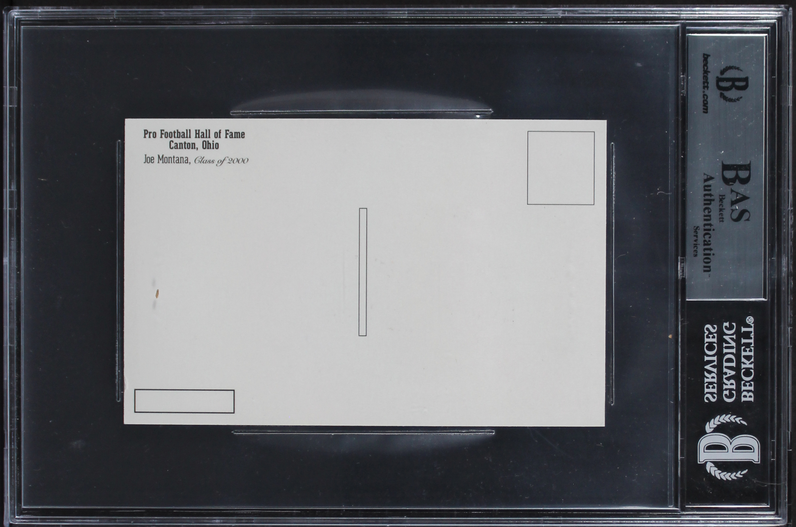 This Autographed Auto Graded Gem Mint 10! 3.5x5.5 HOF Plaque Postcard has been Personally Signed by Joe Montana of the San Francisco 49ers. This item is 100% Authentic, it comes slabbed and authenticated by Beckett Authentication Services. The authenticity can be verified on Beckett Authentication Services website.