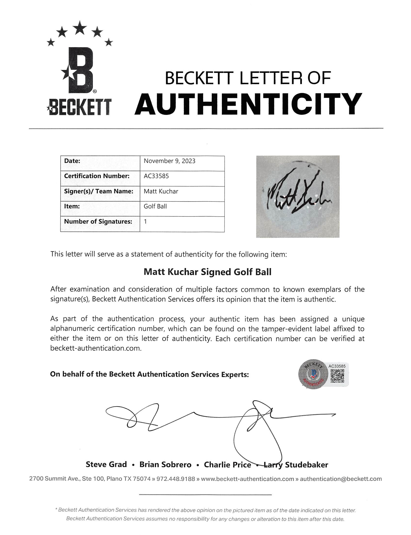 This Autographed Waste Management Open Logo Bridgestone Golf Ball has been Personally Signed by Matt Kuchar. This item is 100% Authentic to include a Certificate of Authenticity (COA) / hologram by Beckett Authentication Services. The authenticity can be verified on Beckett Authentication Services website.