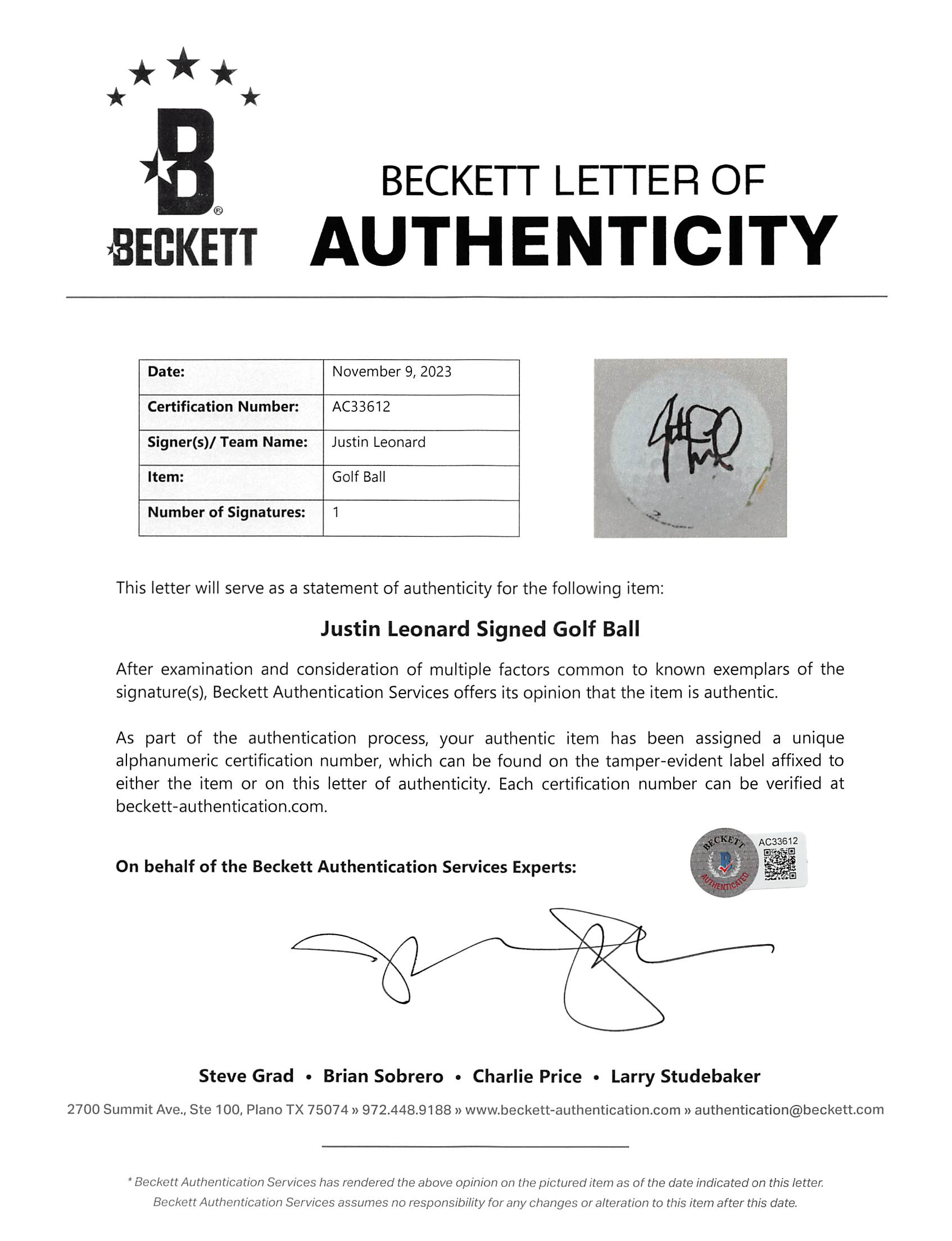 This Autographed Bridgestone Waste Management Open Logo Golf Ball has been Personally Signed by Justin Leonard. This item is 100% Authentic to include a Certificate of Authenticity (COA) / hologram by Beckett Authentication Services. The authenticity can be verified on Beckett Authentication Services website.
