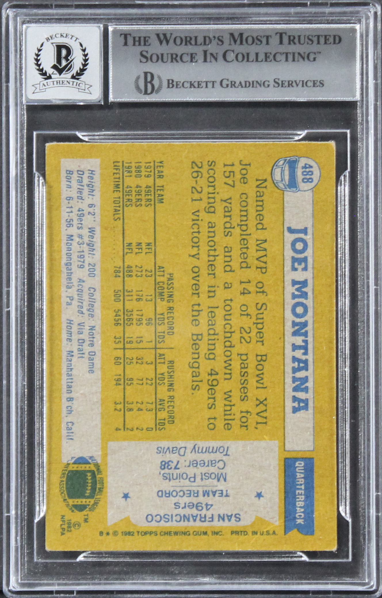This Autographed Auto Graded Gem Mint 10! 1982 Topps #488 Card has been Personally Signed by Joe Montana of the San Francisco 49ers. This item is 100% Authentic, it comes slabbed and authenticated by Beckett Authentication Services. The authenticity can be verified on Beckett Authentication Services website.