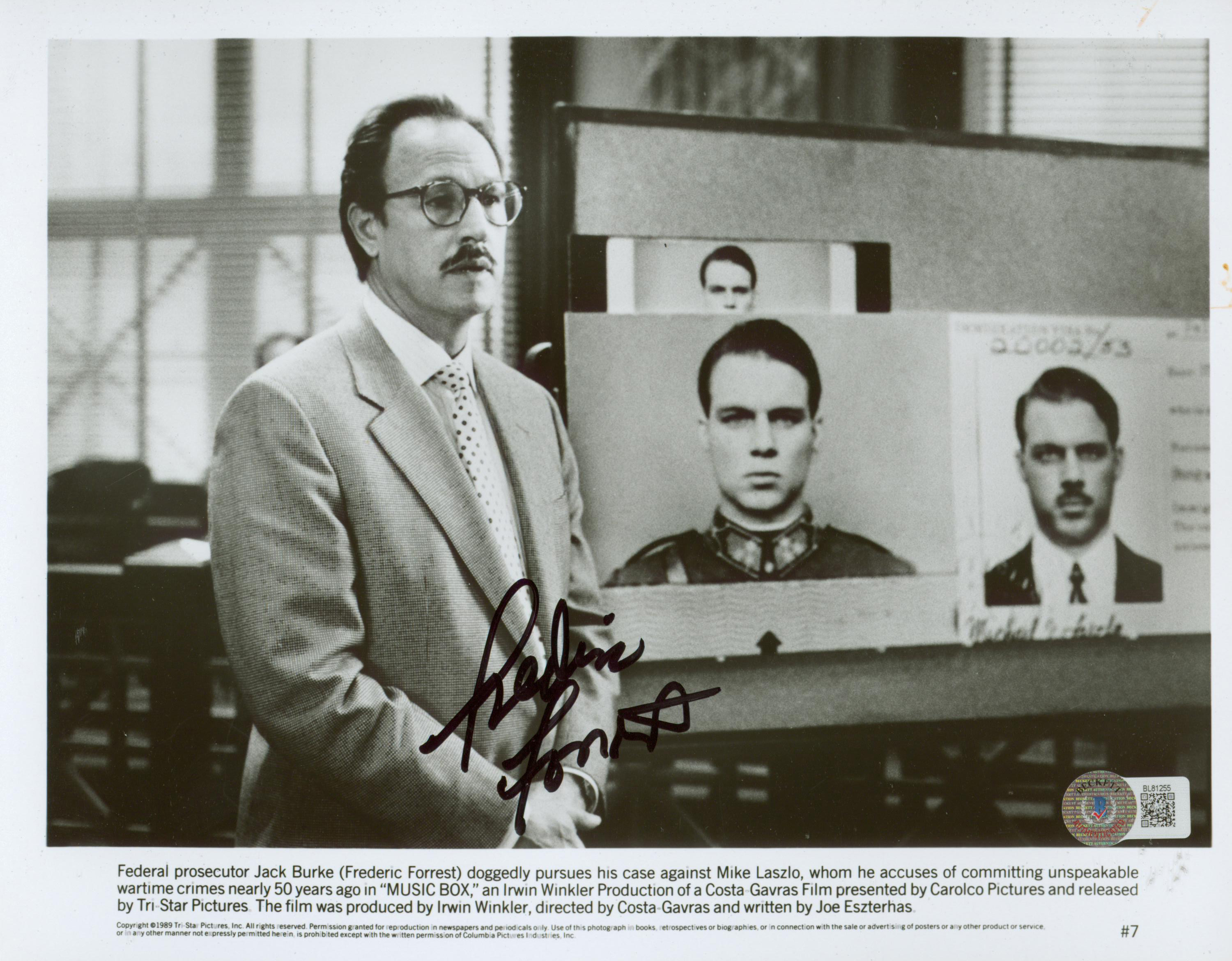 This Autographed 8x10 Photo has been Personally Signed by Frederic Forrest of Music Box. This item is 100% Authentic to include a hologram by Beckett Authentication Services. This item will come with an affixed Beckett Authentication Services (BAS) authentication sticker, which includes a scannable QR code to verify authenticity. Please note that Beckett no longer provides serial-numbered COA cards, and the attached BAS sticker will serve as the complete authentication for this item. The authenticity can be verified on Beckett Authentication Services website.