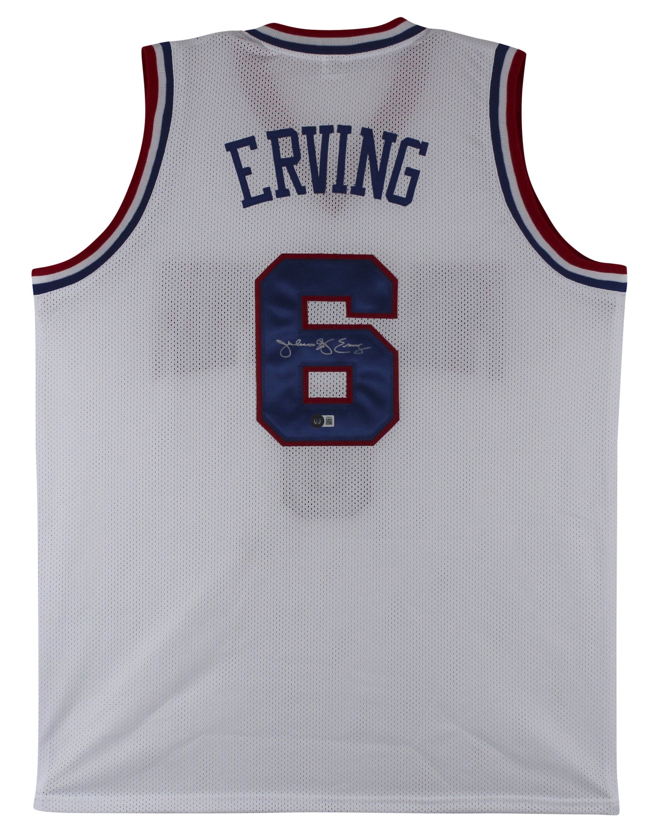 This Autographed White Pro Style Jersey has been Personally Signed by Julius "Dr. J" Erving of the Philadelphia 76ers. This item is 100% Authentic to include a hologram by Beckett Authentication Services. This item may come with the new Beckett Authentication hologram that has a scannable QR code rather than the traditional COA. If you would like to have a COA, you are welcome to reach out to Beckett for a printed certification once you receive your item. This is a BAS Witnessed Protection Program item which means a Beckett Authentication Service representative was present when this item was being signed. We conducted an autograph signing with Julius "Dr. J" Erving where multiples of the same item were signed. While the photographs are representative of this item, the size, placement and strength of the signature may vary. Each item is hand signed, therefore, each autograph is unique. This item can be verified through BAS Witnessed. This is a X-Large sized, non-branded, custom-stitched Jersey.