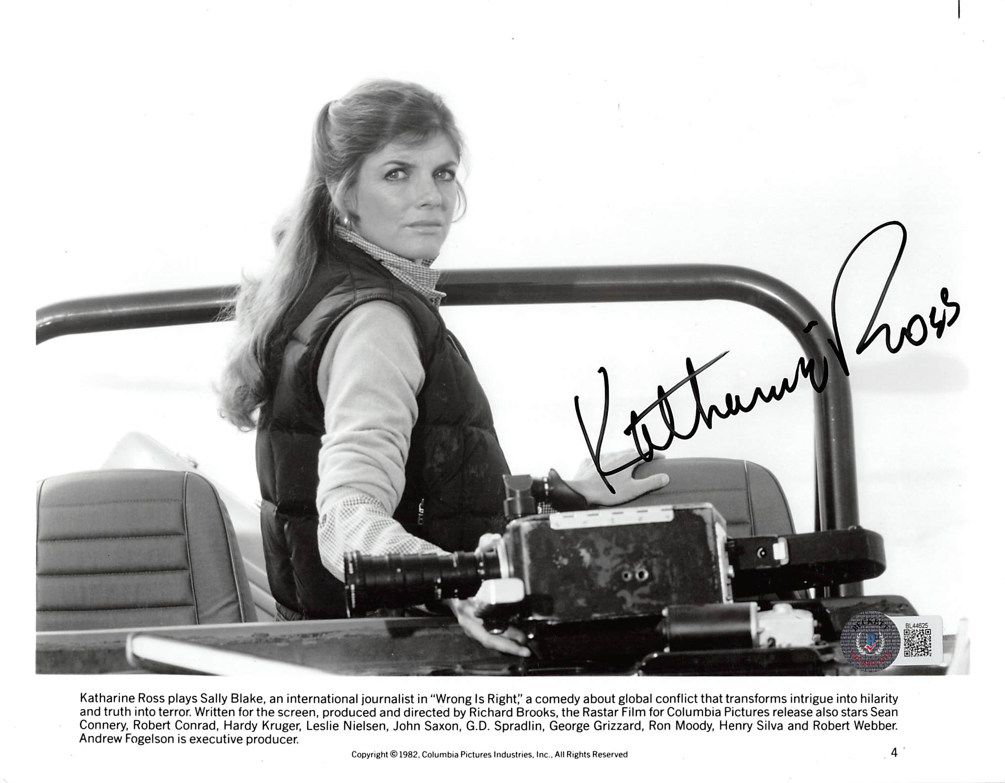 This Autographed 8x10 Photo has been Personally Signed by Katharine Ross of Wrong Is Right. This item is 100% Authentic to include a hologram by Beckett Authentication Services. This item will come with an affixed Beckett Authentication Services (BAS) authentication sticker, which includes a scannable QR code to verify authenticity. Please note that Beckett no longer provides serial-numbered COA cards, and the attached BAS sticker will serve as the complete authentication for this item. The authenticity can be verified on Beckett Authentication Services website.
