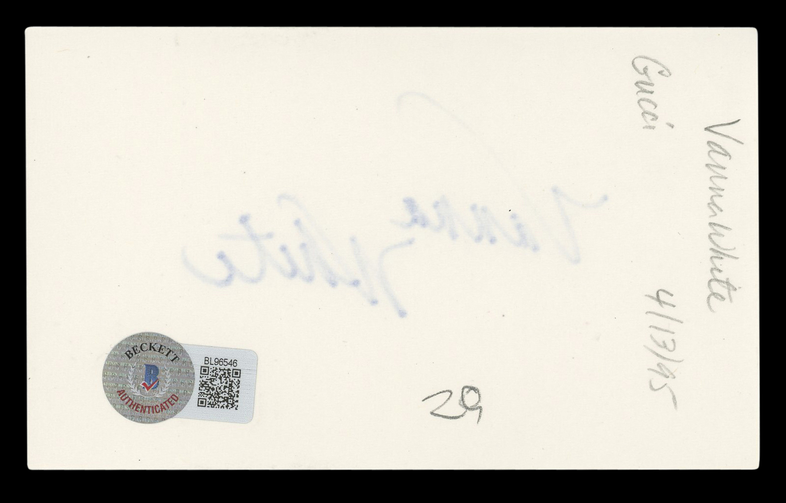 This Autographed 3x5 Index Card has been Personally Signed by Vanna White of Wheel of Fortune. This item is 100% Authentic to include a hologram by Beckett Authentication Services. This item will come with an affixed Beckett Authentication Services (BAS) authentication sticker, which includes a scannable QR code to verify authenticity. Please note that Beckett no longer provides serial-numbered COA cards, and the attached BAS sticker will serve as the complete authentication for this item. The authenticity can be verified on Beckett Authentication Services website.