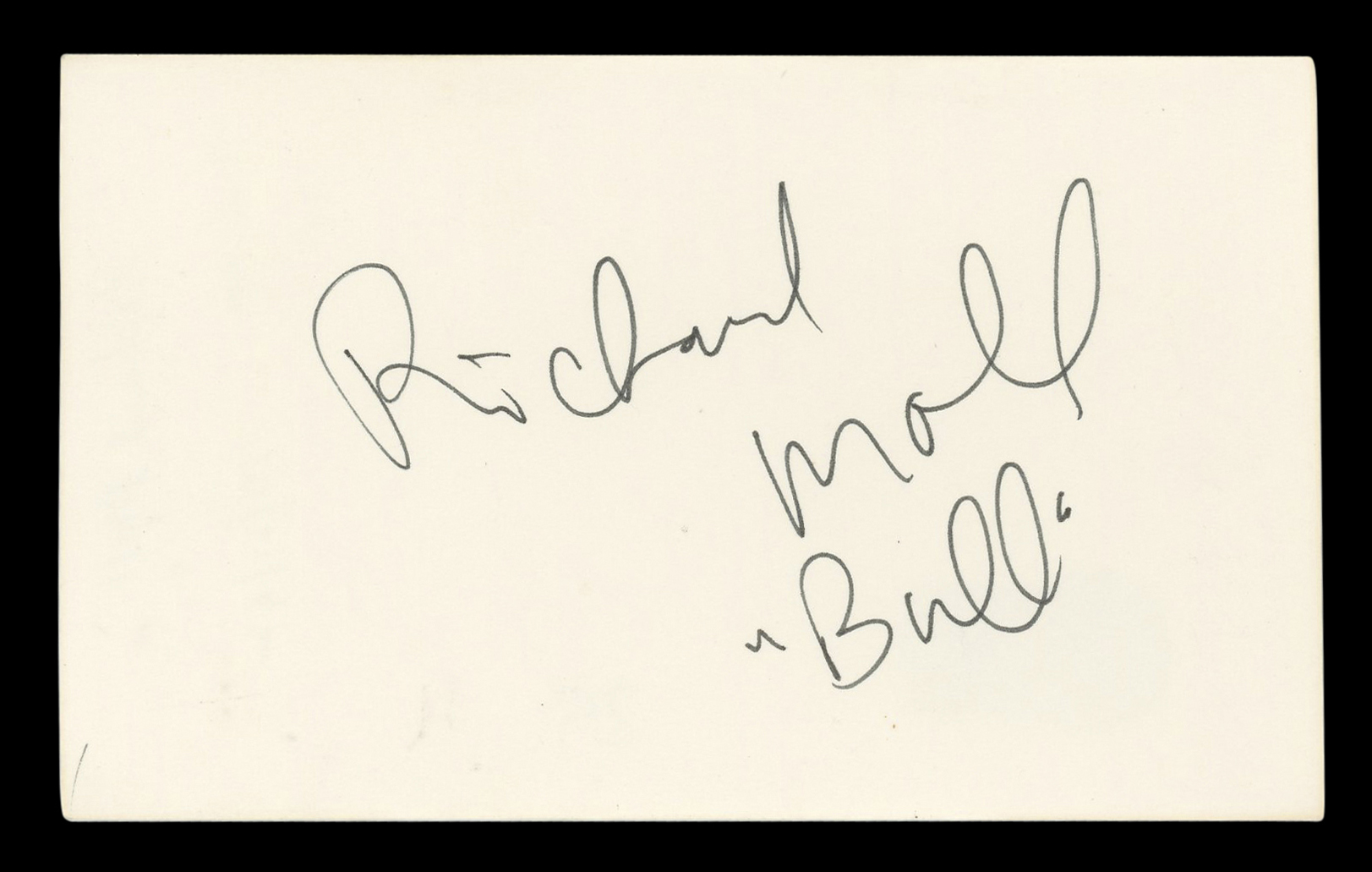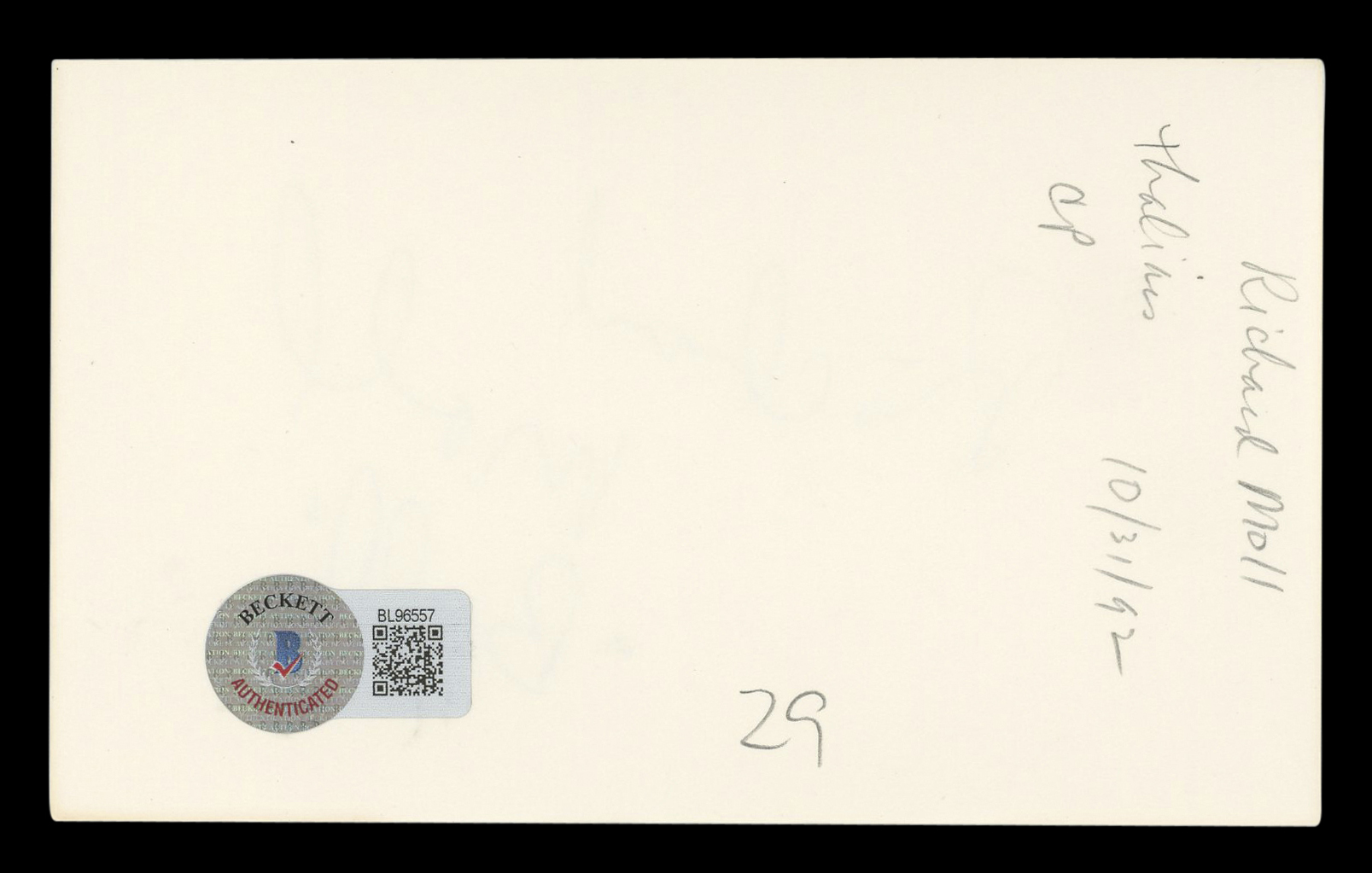 This Autographed 3x5 Index Card with the inscription of "Bull" has been Personally Signed by Richard Moll of Night Court. This item is 100% Authentic to include a hologram by Beckett Authentication Services. This item will come with an affixed Beckett Authentication Services (BAS) authentication sticker, which includes a scannable QR code to verify authenticity. Please note that Beckett no longer provides serial-numbered COA cards, and the attached BAS sticker will serve as the complete authentication for this item. The authenticity can be verified on Beckett Authentication Services website.