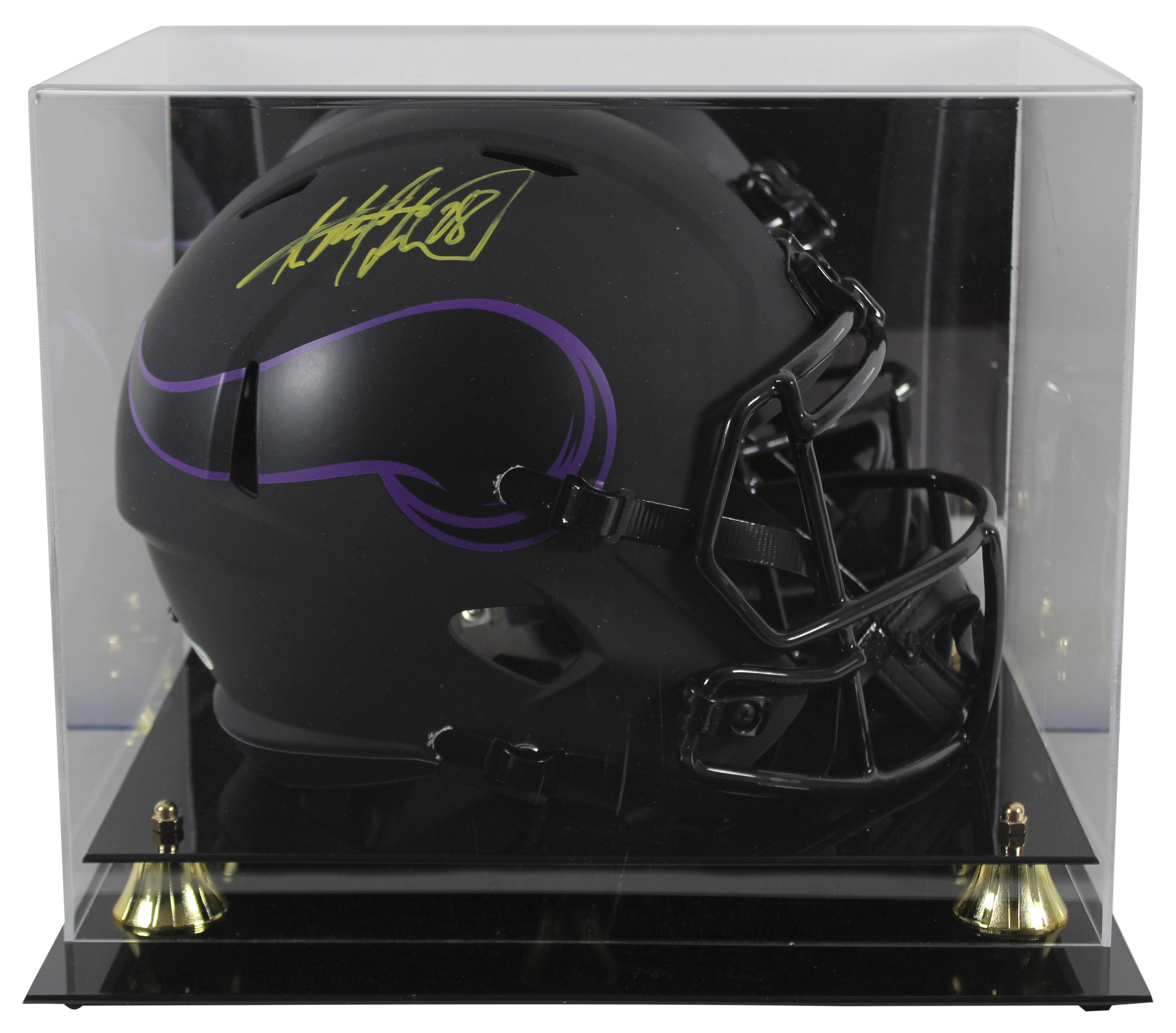This Autographed Alternate Eclipse Riddell Full Size Speed Rep Helmet W/ Uv Mirrored Back Acrylic Display Case has been Personally Signed by Adrian Peterson of the Minnesota Vikings. This item is 100% Authentic to include a Certificate of Authenticity (COA) / hologram by Beckett Authentication Services. This is a BAS Witnessed Protection Program item which means a Beckett Authentication Service representative was present when this item was being signed. We conducted an autograph signing with Adrian Peterson where multiples of the same item were signed. While the photographs are representative of this item, the size, placement and strength of the signature may vary. Each item is hand signed, therefore, each autograph is unique. This item can be verified through BAS Witnessed.