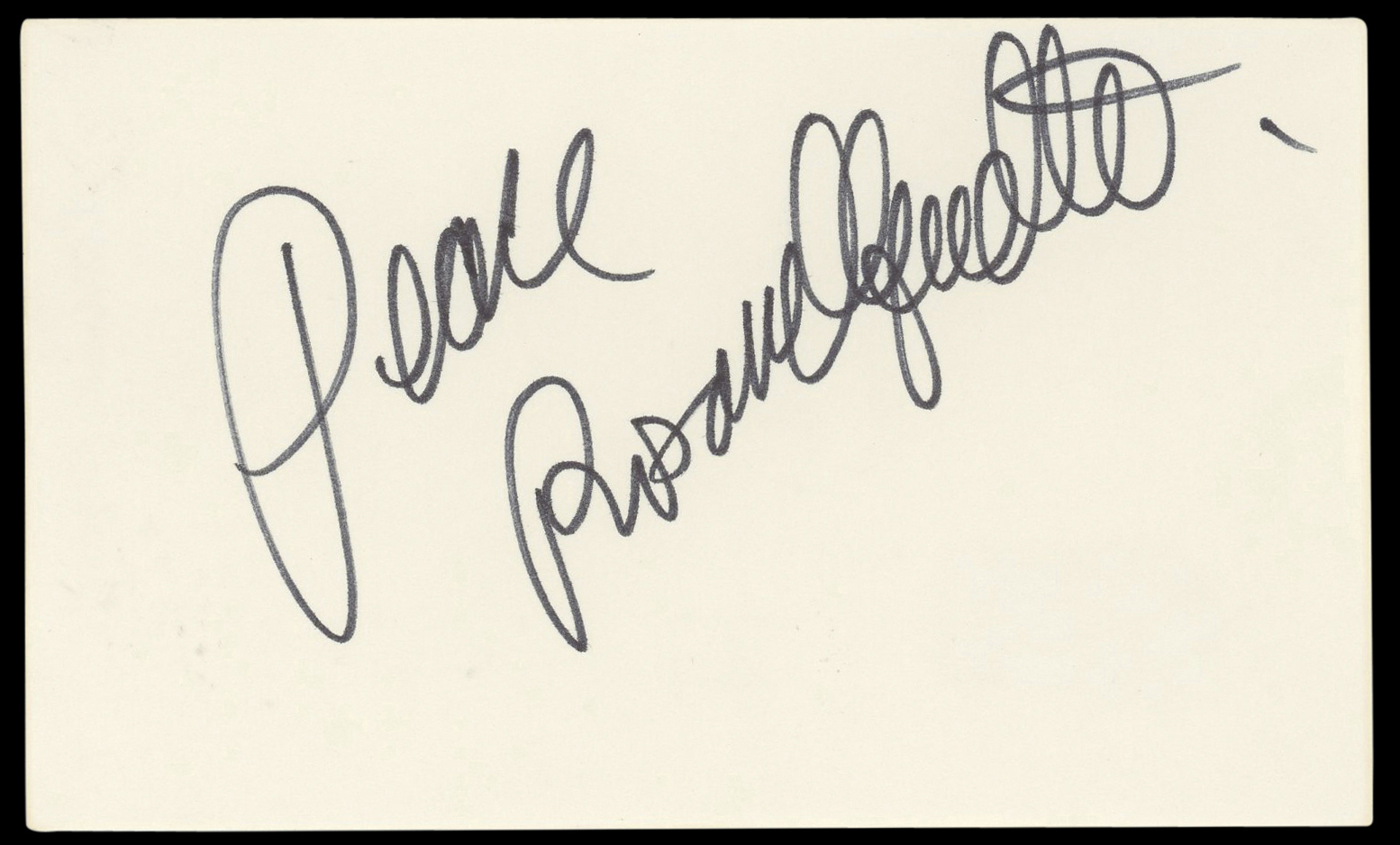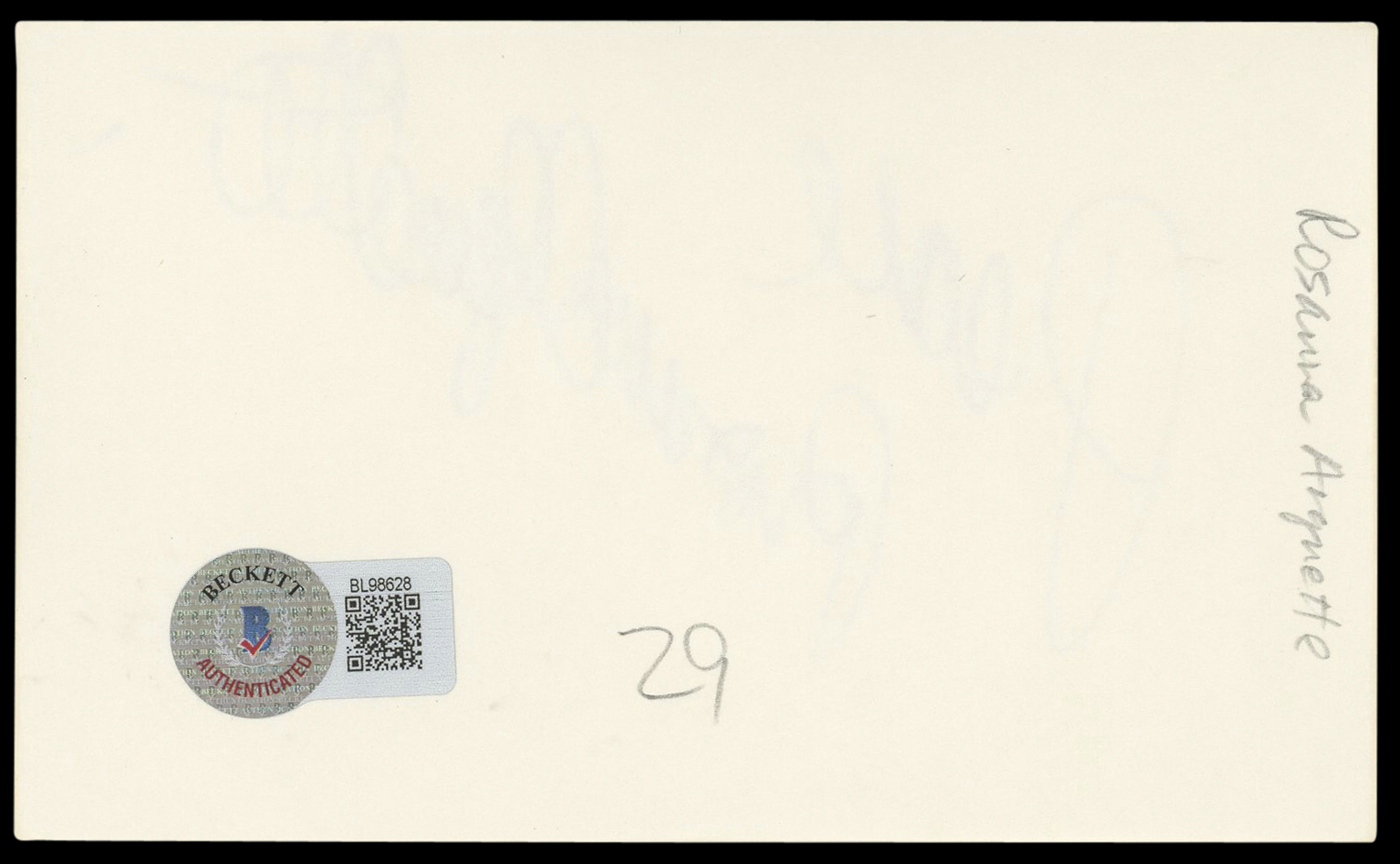 This Autographed 3x5 Index Card with the inscription of "Peace" has been Personally Signed by Rosanna Arquette. This item is 100% Authentic to include a hologram by Beckett Authentication Services. This item will come with an affixed Beckett Authentication Services (BAS) authentication sticker, which includes a scannable QR code to verify authenticity. Please note that Beckett no longer provides serial-numbered COA cards, and the attached BAS sticker will serve as the complete authentication for this item. The authenticity can be verified on Beckett Authentication Services website.