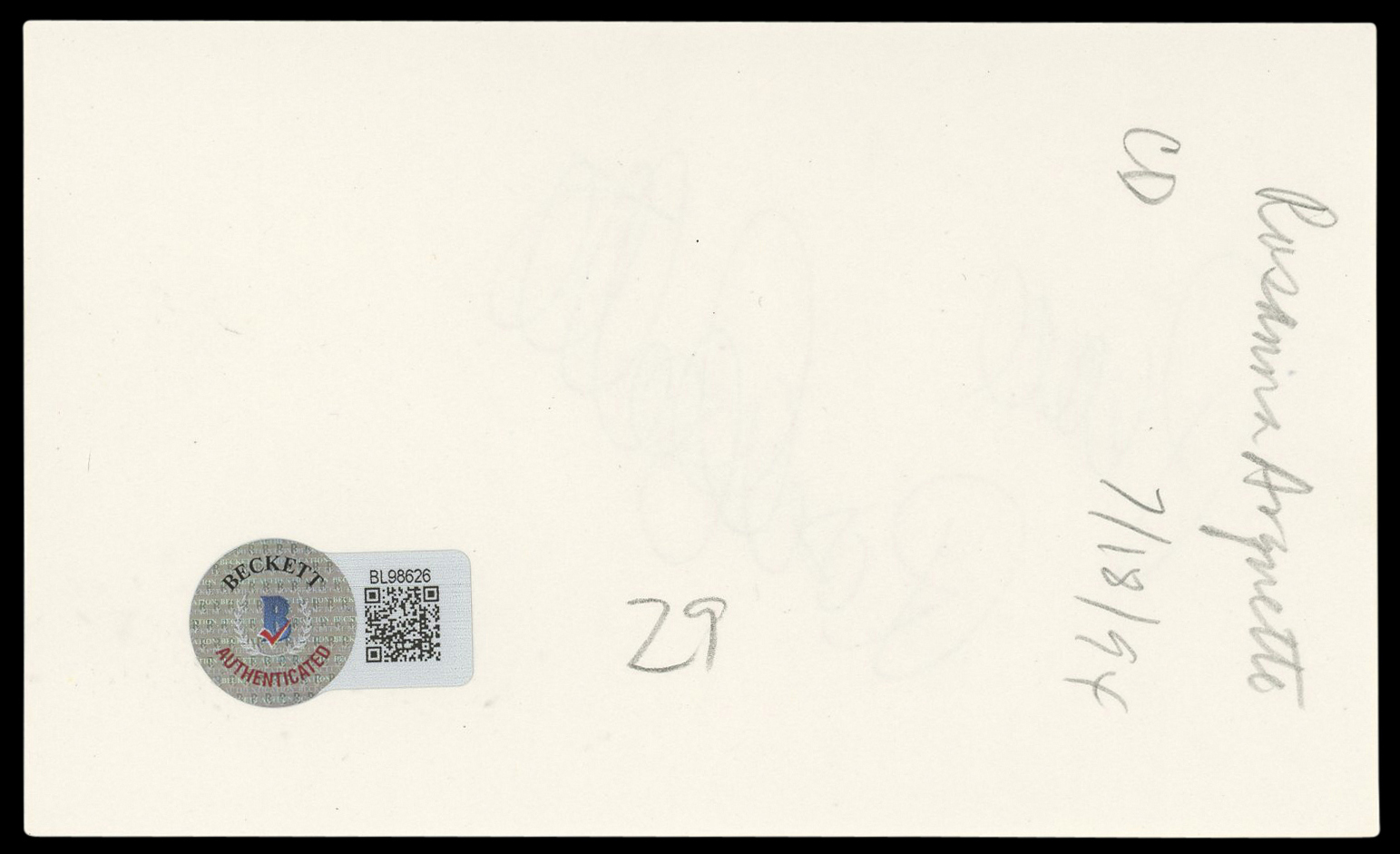 This Autographed 3x5 Index Card with the inscription of "Peace" has been Personally Signed by Rosanna Arquette. This item is 100% Authentic to include a hologram by Beckett Authentication Services. This item will come with an affixed Beckett Authentication Services (BAS) authentication sticker, which includes a scannable QR code to verify authenticity. Please note that Beckett no longer provides serial-numbered COA cards, and the attached BAS sticker will serve as the complete authentication for this item. The authenticity can be verified on Beckett Authentication Services website.