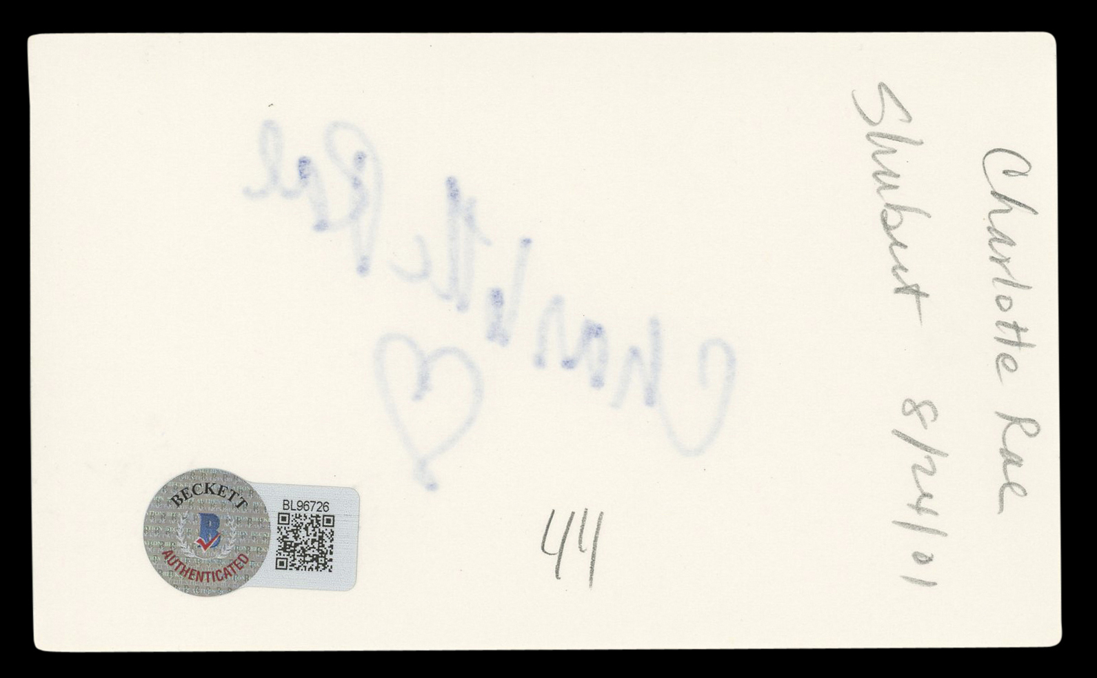 This Autographed 3x5 Index Card has been Personally Signed by Charlotte Rae of The Facts of Life. This item is 100% Authentic to include a hologram by Beckett Authentication Services. This item will come with an affixed Beckett Authentication Services (BAS) authentication sticker, which includes a scannable QR code to verify authenticity. Please note that Beckett no longer provides serial-numbered COA cards, and the attached BAS sticker will serve as the complete authentication for this item. The authenticity can be verified on Beckett Authentication Services website.