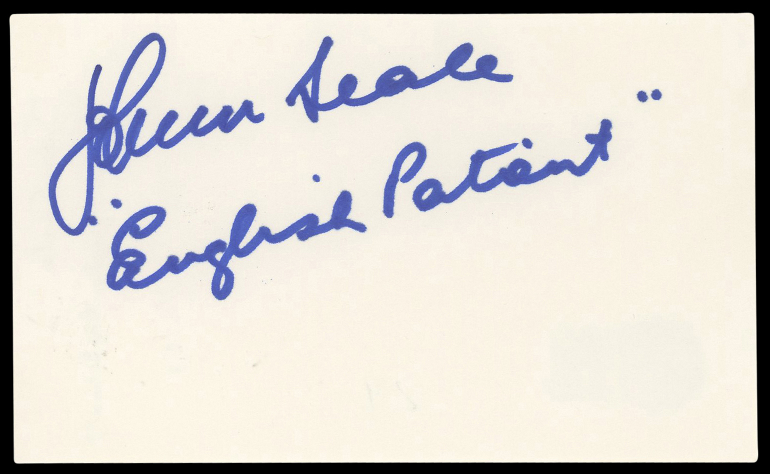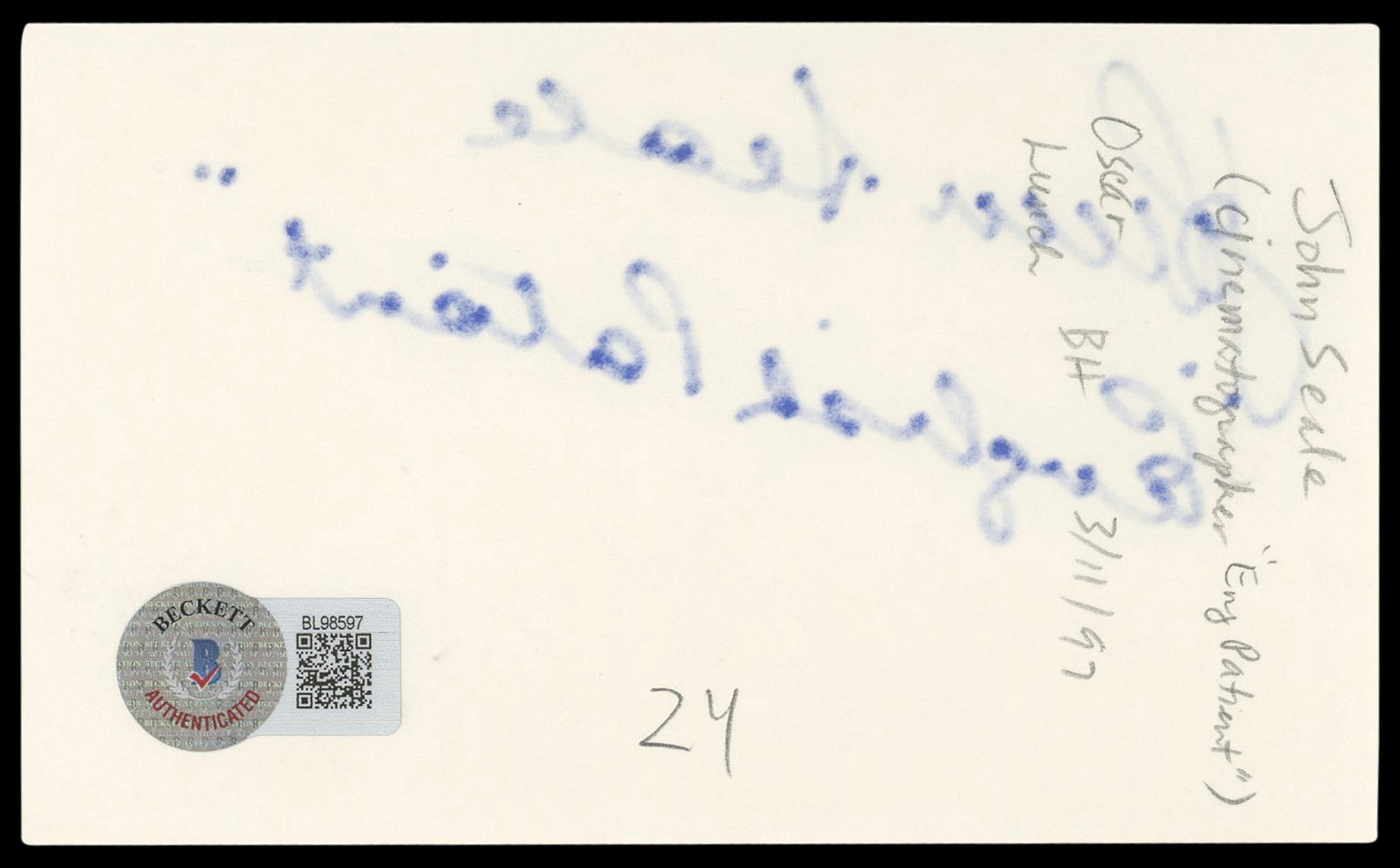 This Autographed 3x5 Index Card with the inscription of "English Patient" has been Personally Signed by John Seale of The English Patient. This item is 100% Authentic to include a hologram by Beckett Authentication Services. This item will come with an affixed Beckett Authentication Services (BAS) authentication sticker, which includes a scannable QR code to verify authenticity. Please note that Beckett no longer provides serial-numbered COA cards, and the attached BAS sticker will serve as the complete authentication for this item. The authenticity can be verified on Beckett Authentication Services website.