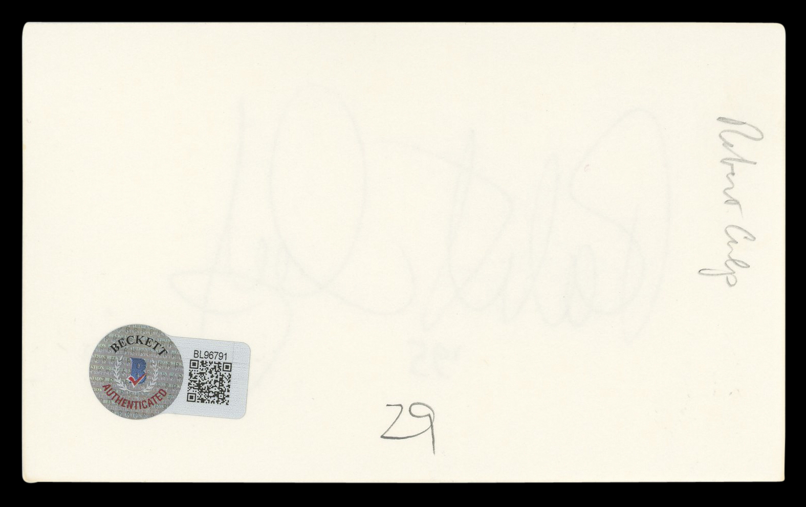 This Autographed 3x5 Index Card with the inscription of "95" has been Personally Signed by Robert Culp of I Spy. This item is 100% Authentic to include a hologram by Beckett Authentication Services. This item will come with an affixed Beckett Authentication Services (BAS) authentication sticker, which includes a scannable QR code to verify authenticity. Please note that Beckett no longer provides serial-numbered COA cards, and the attached BAS sticker will serve as the complete authentication for this item. The authenticity can be verified on Beckett Authentication Services website.