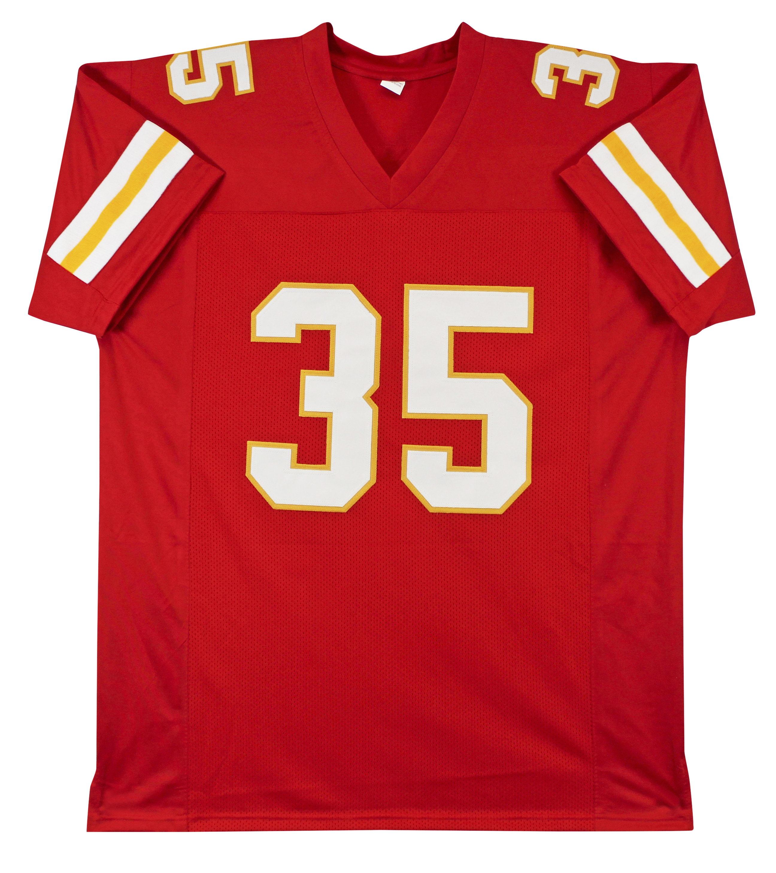 This Autographed Red Pro Style Jersey has been Personally Signed by Christian Okoye of the Kansas City Chiefs. This item is 100% Authentic to include a hologram by Beckett Authentication Services. This item will come with the new Beckett Authentication hologram that has a scannable QR code rather than the traditional COA. If you would like to have a COA, you are welcome to reach out to Beckett for a printed certification once you receive your item. This is a BAS Witnessed Protection Program item which means a Beckett Authentication Service representative was present when this item was being signed. We conducted an autograph signing with Christian Okoye where multiples of the same item were signed. While the photographs are representative of this item, the size, placement and strength of the signature may vary. Each item is hand signed, therefore, each autograph is unique. This item can be verified through BAS Witnessed. This is a X-Large sized, non-branded, custom-stitched Jersey.