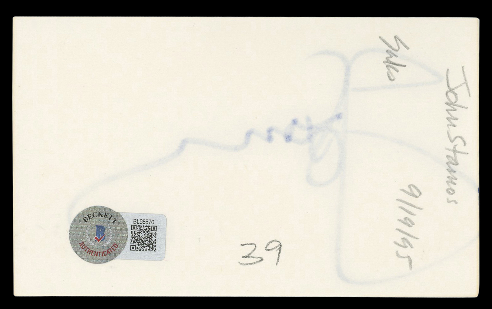 This Autographed 3x5 Index Card has been Personally Signed by John Stamos of Full House. This item is 100% Authentic to include a hologram by Beckett Authentication Services. This item will come with an affixed Beckett Authentication Services (BAS) authentication sticker, which includes a scannable QR code to verify authenticity. Please note that Beckett no longer provides serial-numbered COA cards, and the attached BAS sticker will serve as the complete authentication for this item. The authenticity can be verified on Beckett Authentication Services website.