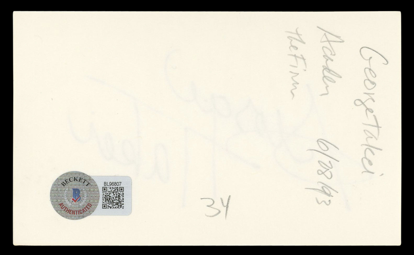 This Autographed 3x5 Index Card has been Personally Signed by George Takei of Star Trek: The Original Series. This item is 100% Authentic to include a hologram by Beckett Authentication Services. This item will come with an affixed Beckett Authentication Services (BAS) authentication sticker, which includes a scannable QR code to verify authenticity. Please note that Beckett no longer provides serial-numbered COA cards, and the attached BAS sticker will serve as the complete authentication for this item. The authenticity can be verified on Beckett Authentication Services website.