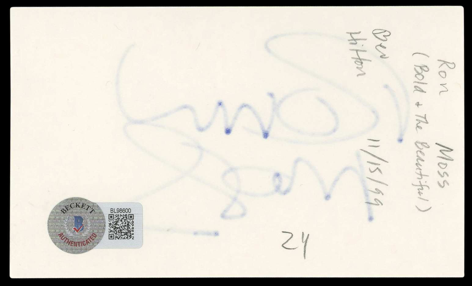 This Autographed 3x5 Index Card has been Personally Signed by Ronn Moss of The Bold and the Beautiful. This item is 100% Authentic to include a hologram by Beckett Authentication Services. This item will come with an affixed Beckett Authentication Services (BAS) authentication sticker, which includes a scannable QR code to verify authenticity. Please note that Beckett no longer provides serial-numbered COA cards, and the attached BAS sticker will serve as the complete authentication for this item. The authenticity can be verified on Beckett Authentication Services website.