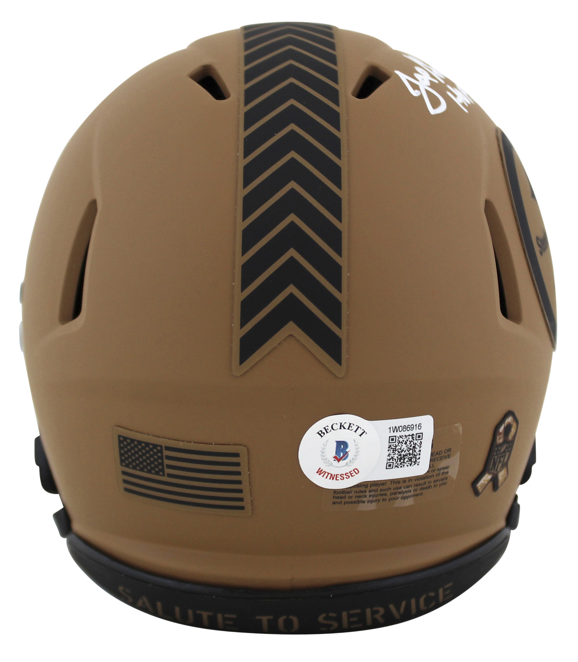 This Autographed Alternate 2023 Salute To Service II Mini Helmet W/ Uv Mirrored Back Acrylic Display Case with the inscription of "HOF 87" has been Personally Signed by Joe Greene of the Pittsburgh Steelers. This item is 100% Authentic to include a hologram by Beckett Authentication Services. This item may come with the new Beckett Authentication hologram that has a scannable QR code rather than the traditional COA. If you would like to have a COA, you are welcome to reach out to Beckett for a printed certification once you receive your item. This is a BAS Witnessed Protection Program item which means a Beckett Authentication Service representative was present when this item was being signed. We conducted an autograph signing with Joe Greene where multiples of the same item were signed. While the photographs are representative of this item, the size, placement and strength of the signature may vary. Each item is hand signed, therefore, each autograph is unique. This item can be verified through BAS Witnessed.